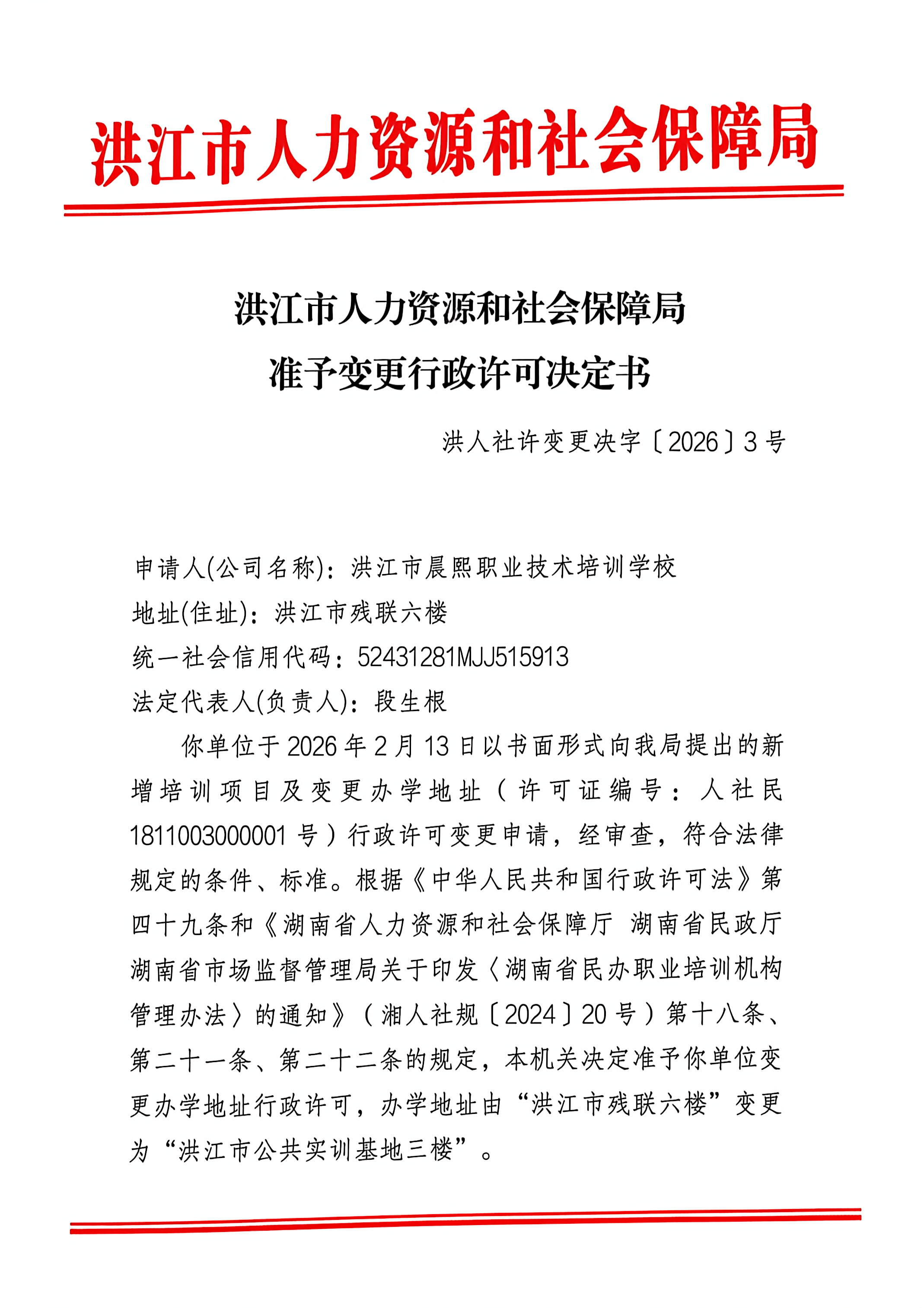 洪江市晨熙职业技术培训学校行政许可变更决定书