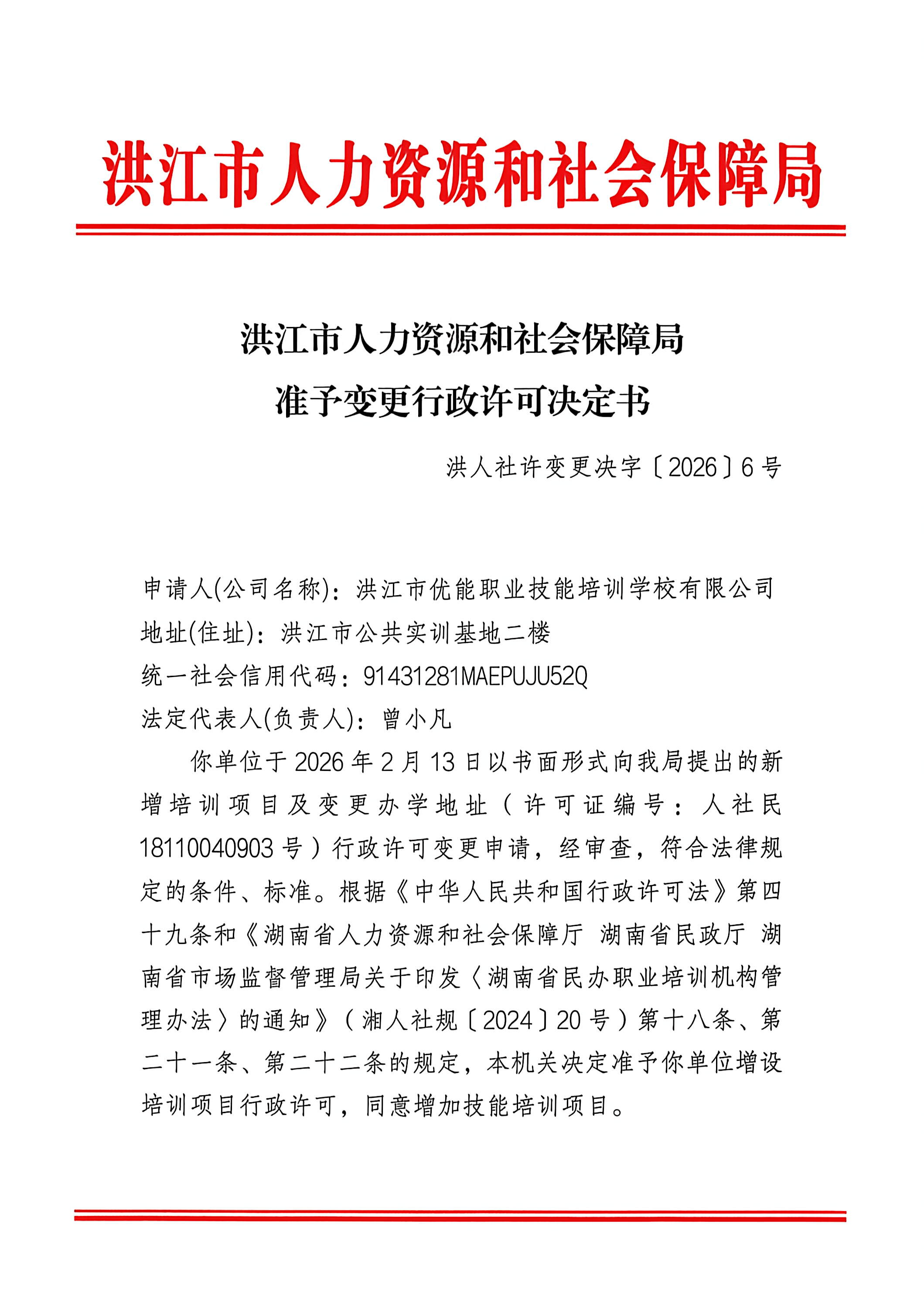 洪江市优能职业技能培训学校有限公司行政许可变更决定书