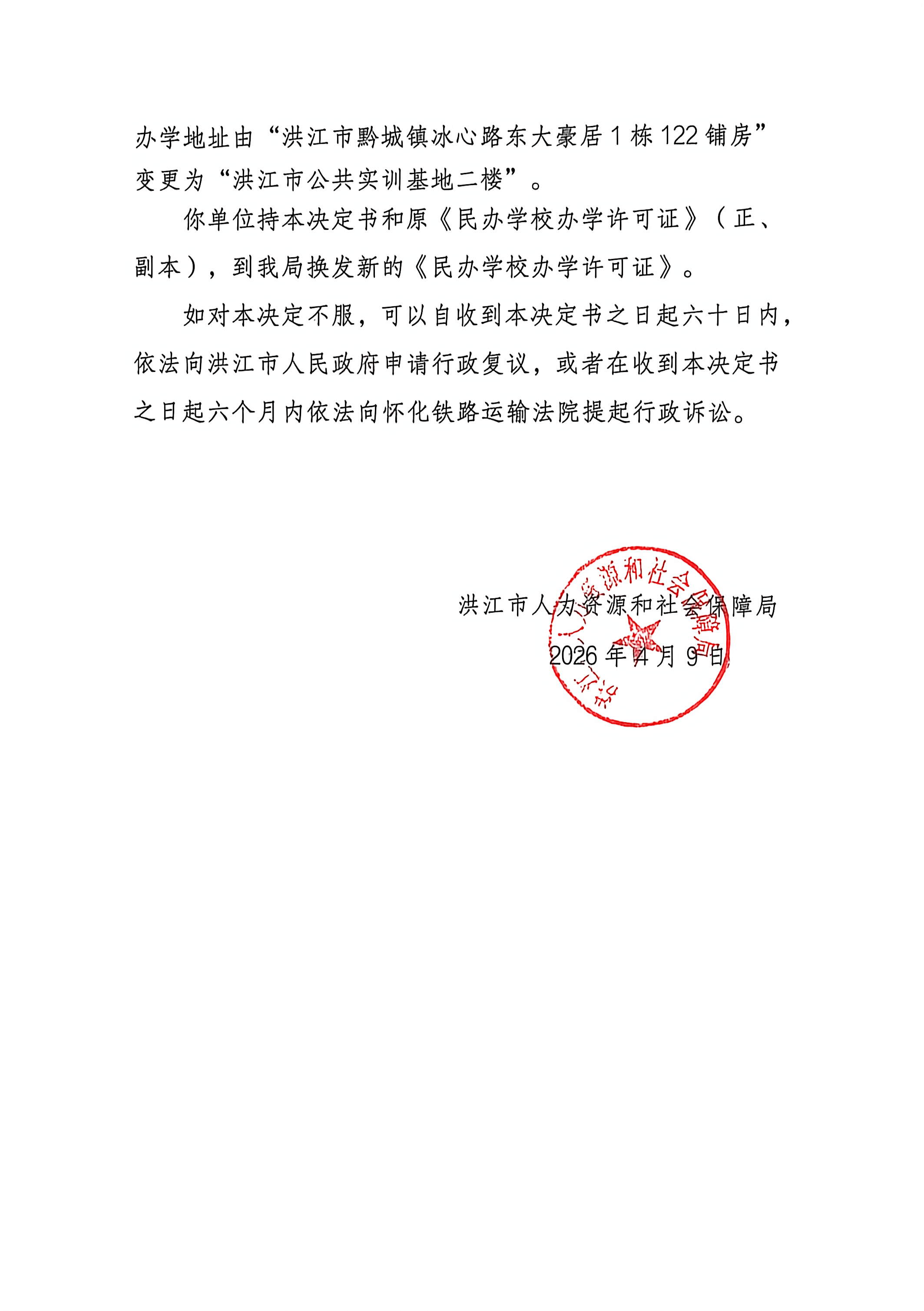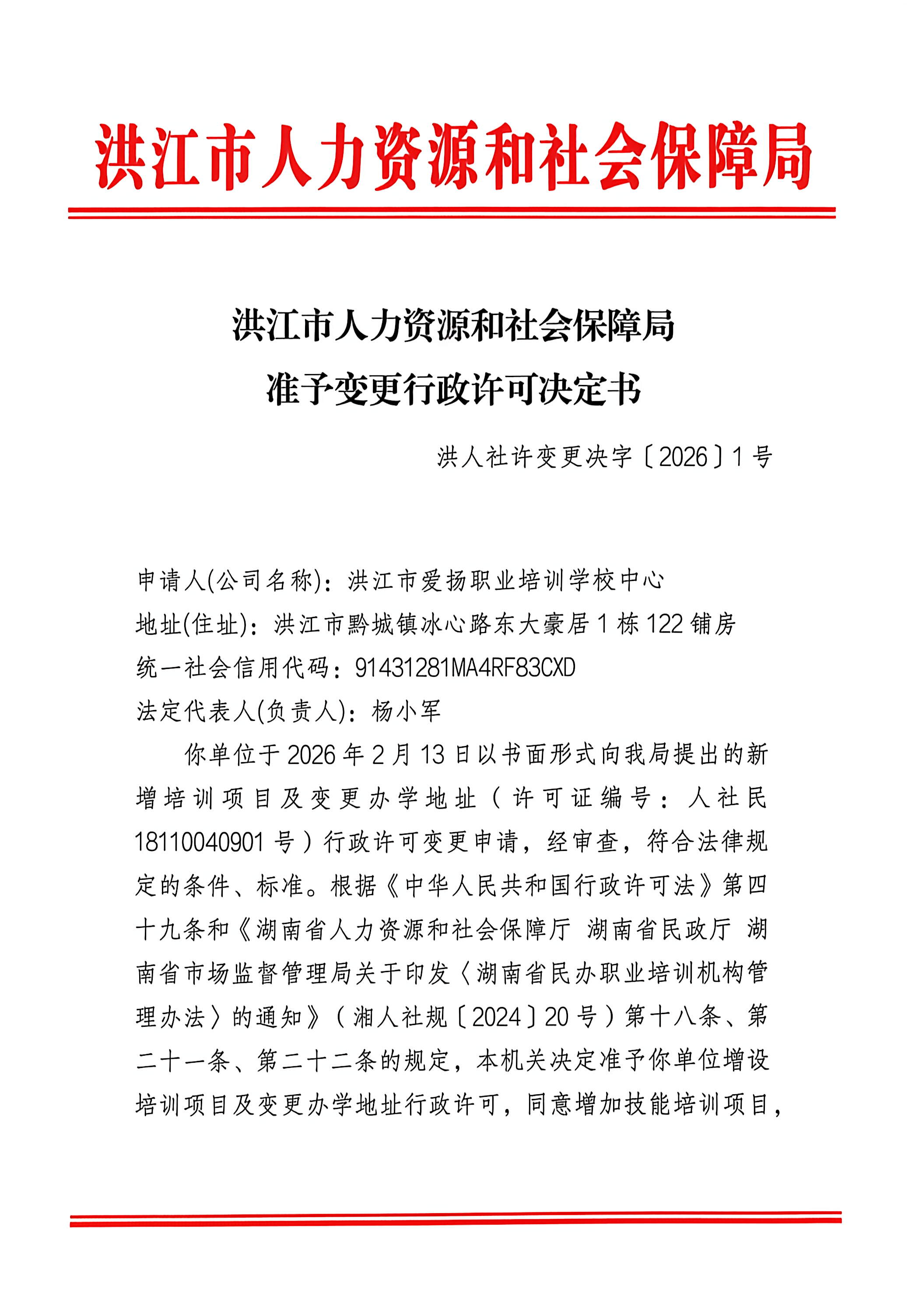 洪江市爱扬职业培训学校中心行政许可变更决定书