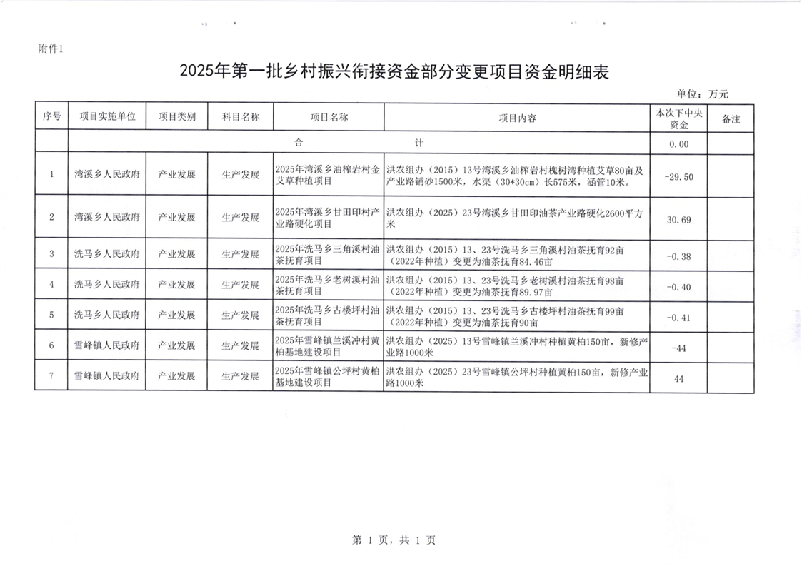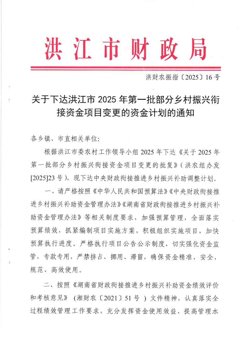 关于下达洪江市2025年第一批部分乡村振兴衔接资金项目变更的资金计划的通知