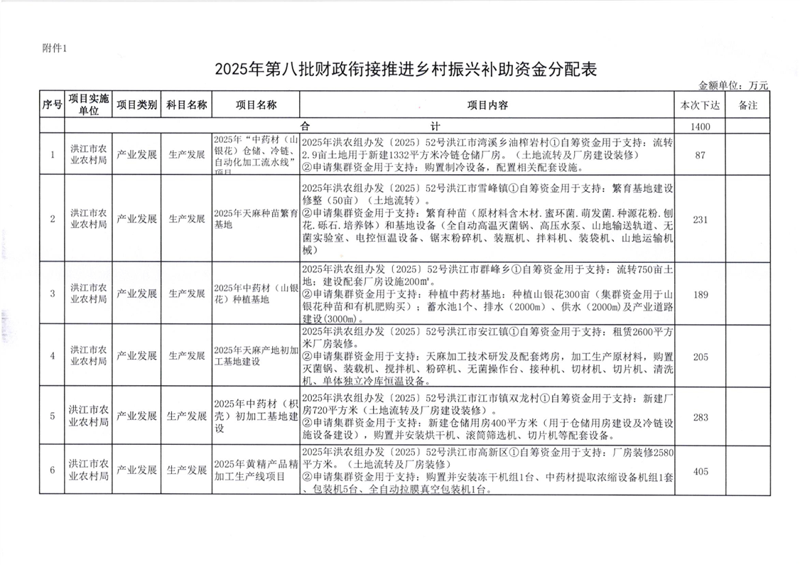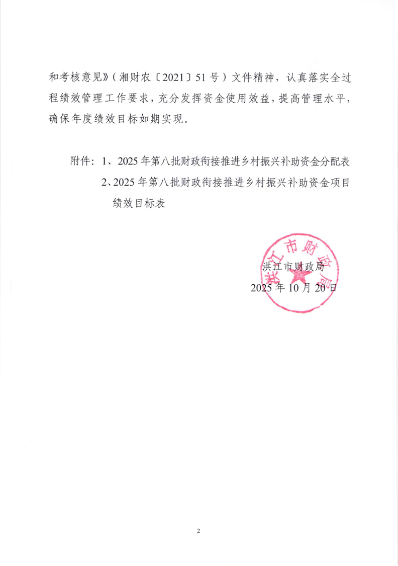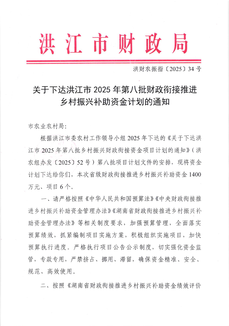 关于下达洪江市2025年第八批财政衔接推进乡村振兴补助资金计划的通知