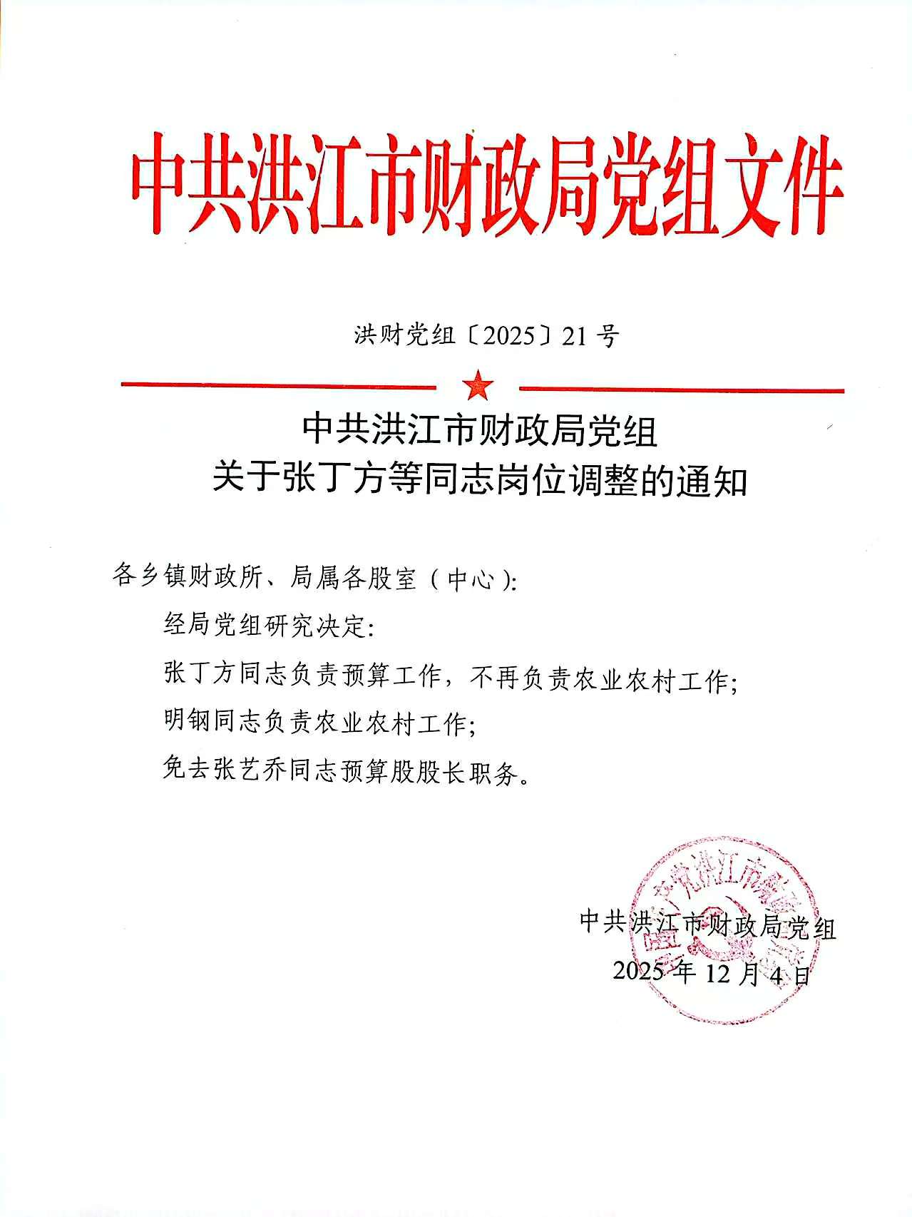 中共洪江市财政局党组关于张丁方等同志岗位调整的通知