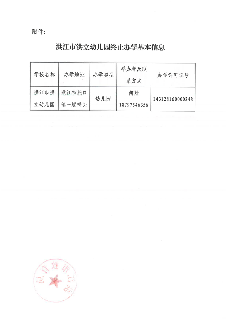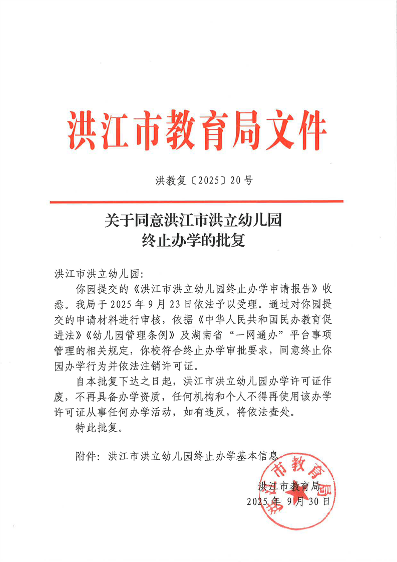 关于同意洪江市洪立幼儿园终止办学的批复