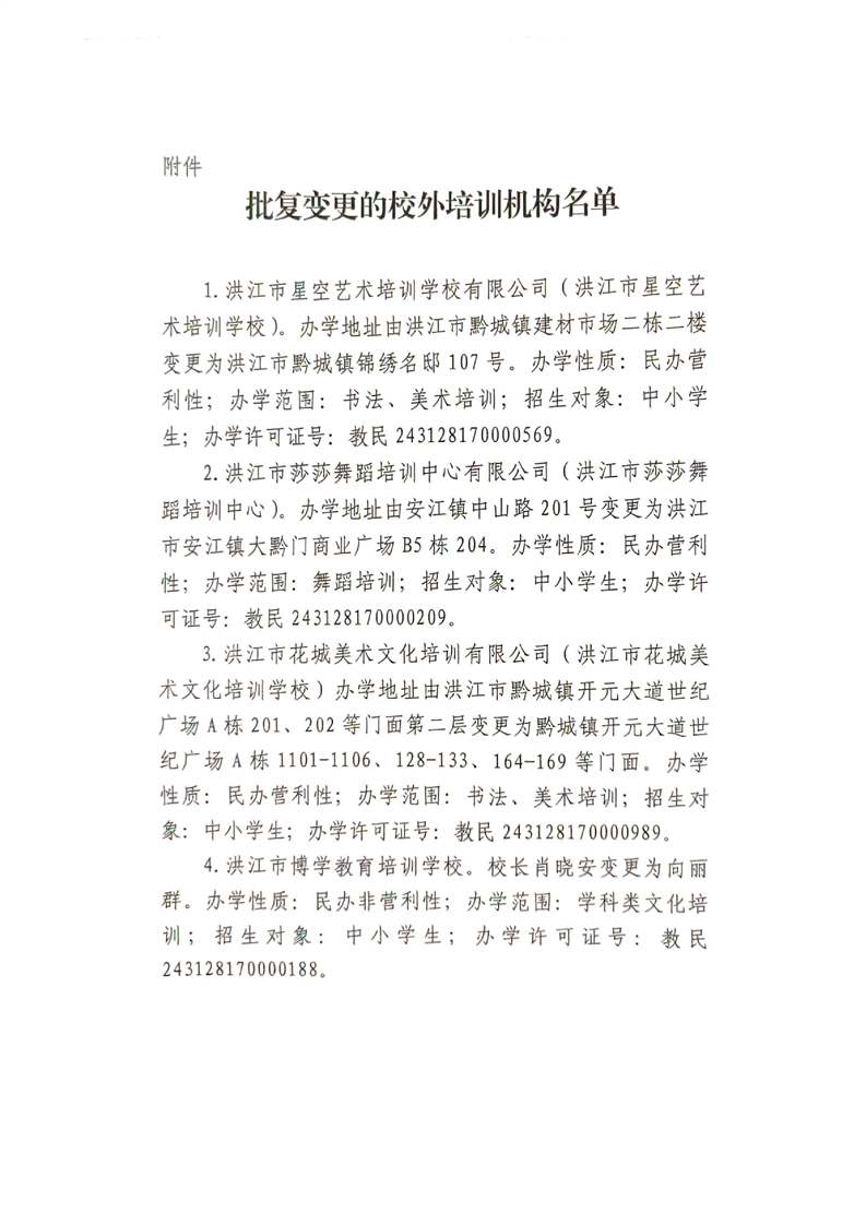关于同意“洪江市星空艺术培训学校”等4所校外培训机构信息变更的批复