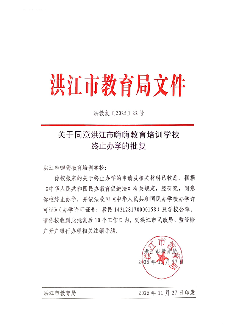关于同意洪江市嗨嗨教育培训学校终止办学的批复
