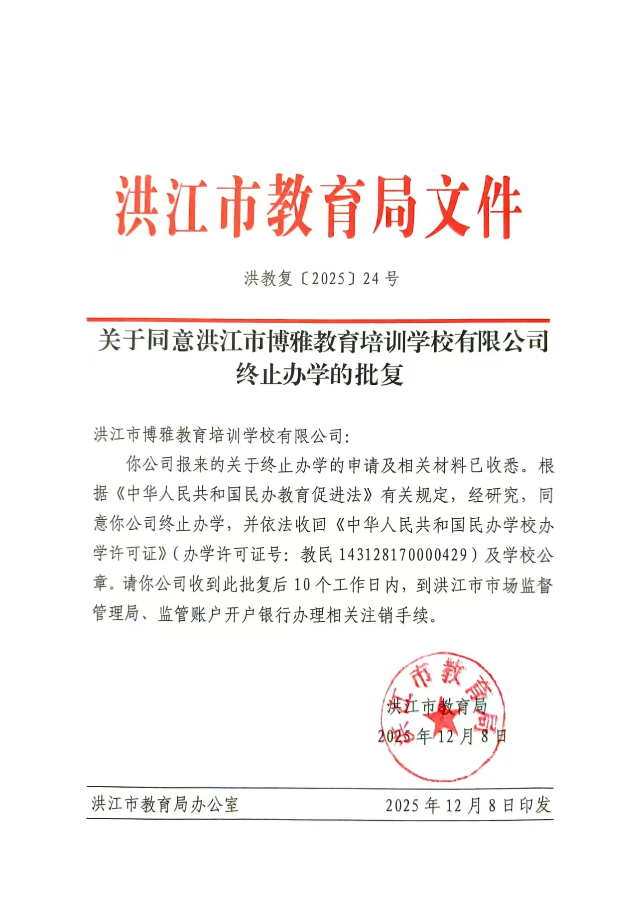关于同意洪江市博雅教育培训学校有限公司终止办学的批复