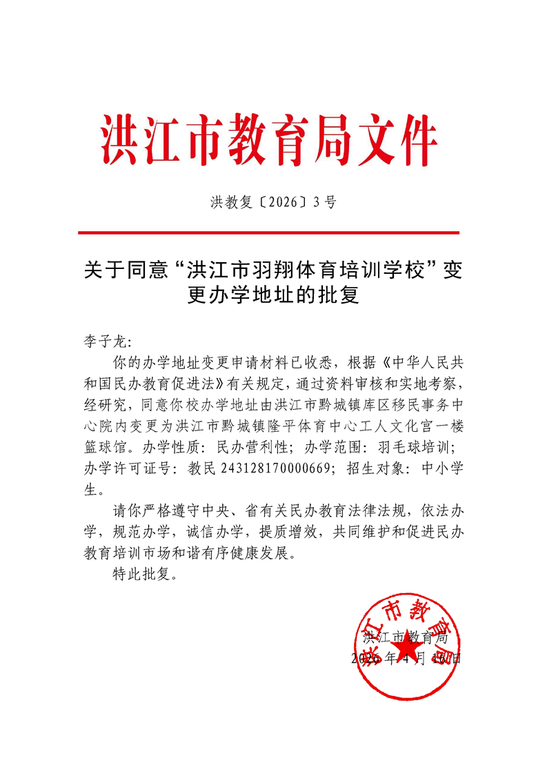 关于同意“洪江市羽翔体育培训学校”变更办学地址的批复