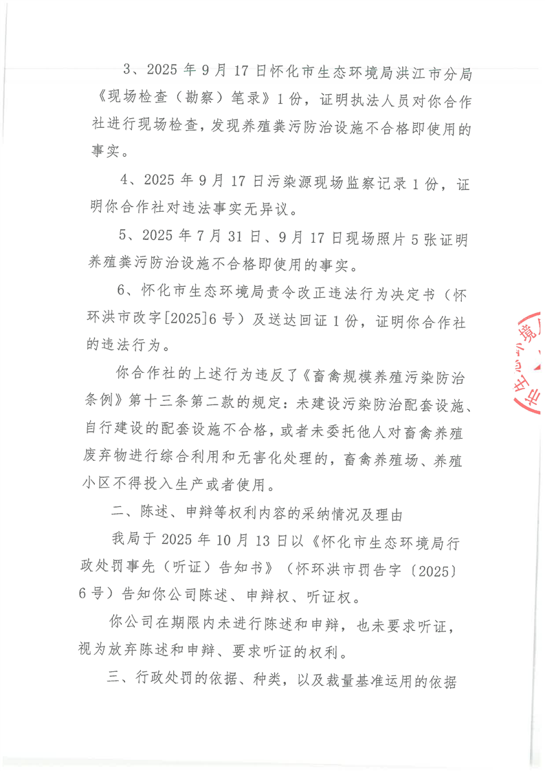 关于对洪江市山鸣生态养殖专业合作社行政处罚决定书的公示(怀环洪市罚字〔2025〕6号)