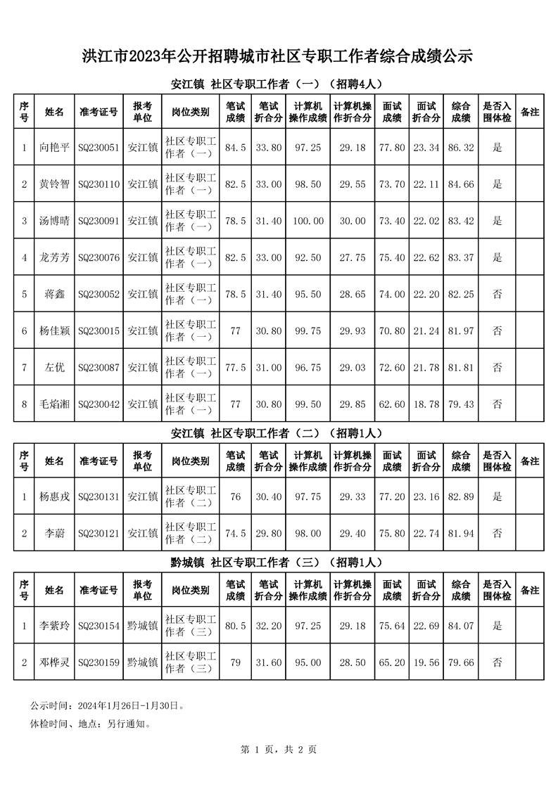 洪江市2023年公开招聘城市社区专职工作者综合成绩公示