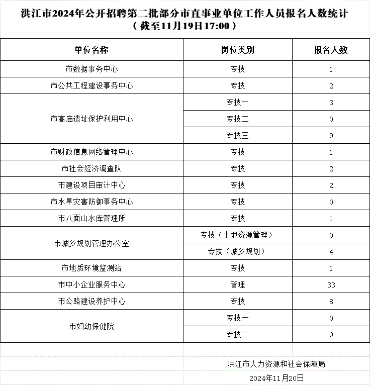 洪江市2024年公开招聘第二批部分市直事业单位工作人员报名人数统计(截至11月19日17:00)