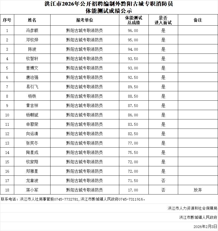 洪江市2026年公开招聘编制外黔阳古城专职消防员体能测试成绩公示