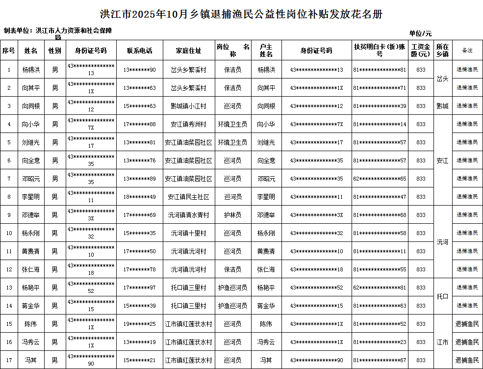 洪江市2025年10月乡镇退捕渔民公益性岗位补贴发放花名册