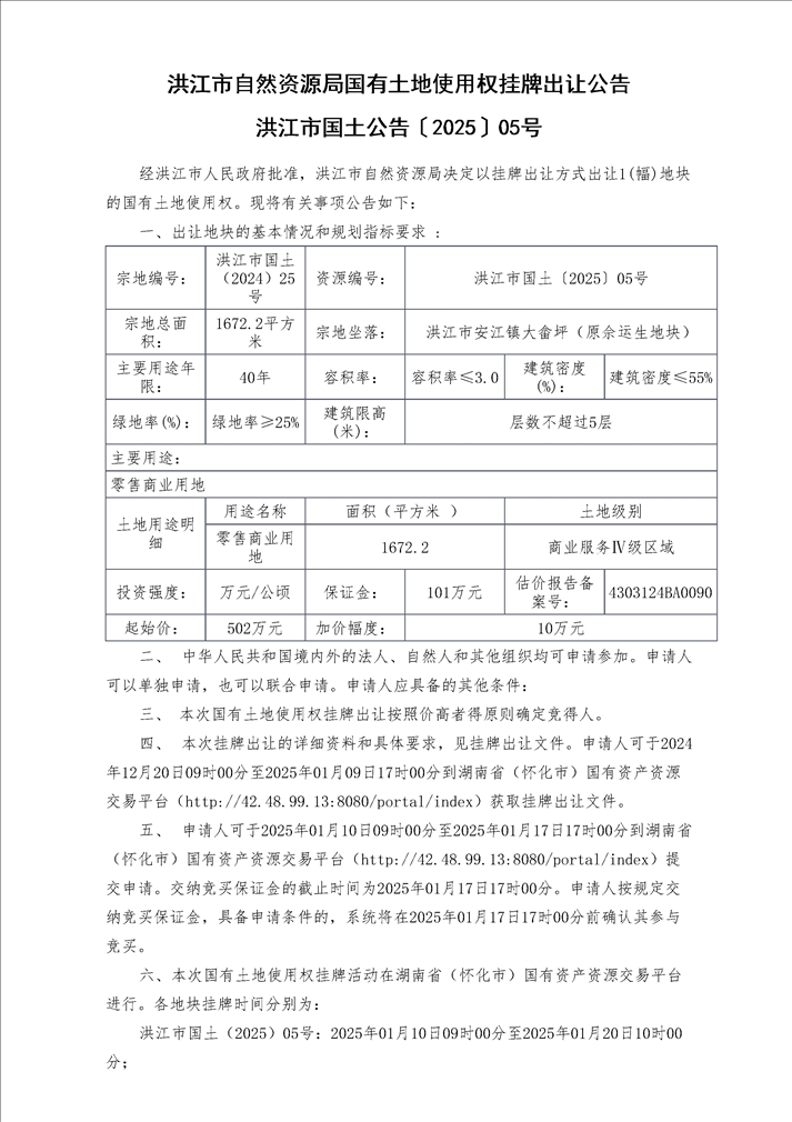 洪江市自然资源局国有土地使用权挂牌出让公告 洪江市国土公告〔2025〕05号