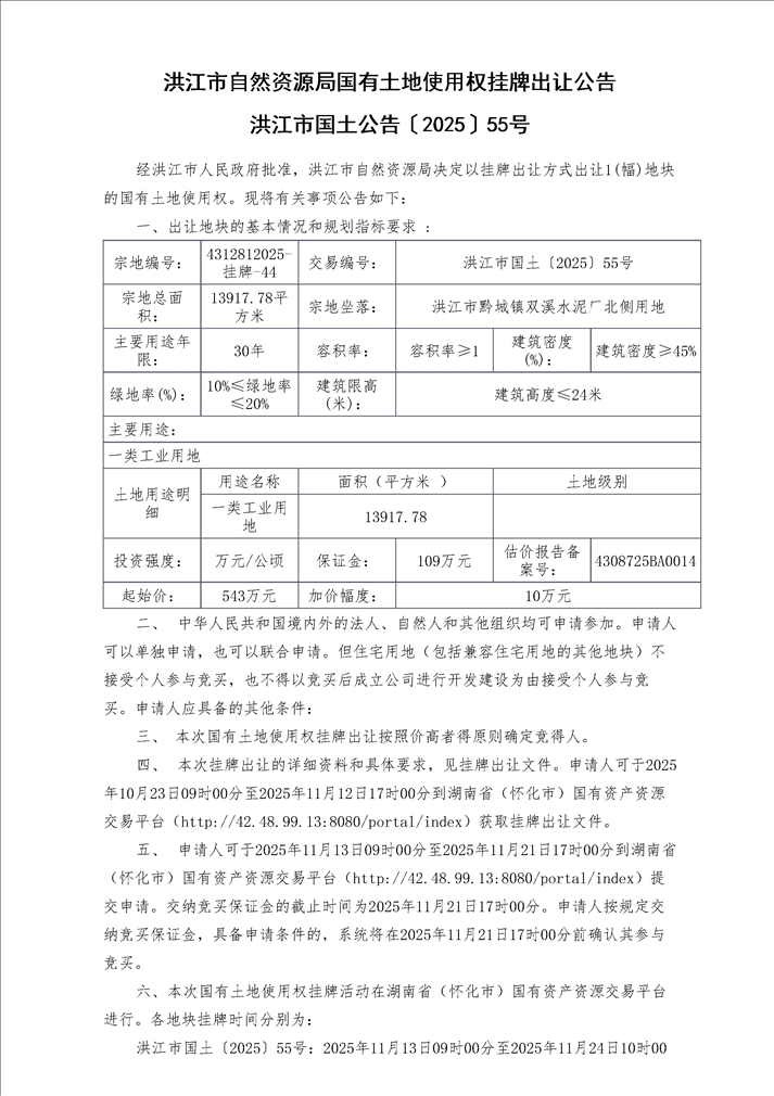 洪江市自然资源局国有土地使用权挂牌出让公告 洪江市国土公告〔2025〕55号