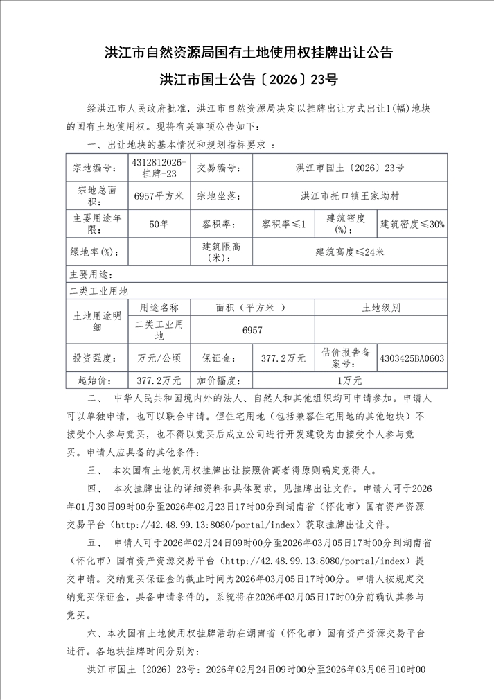 洪江市自然资源局国有土地使用权挂牌出让公告 洪江市国土公告〔2026〕23号