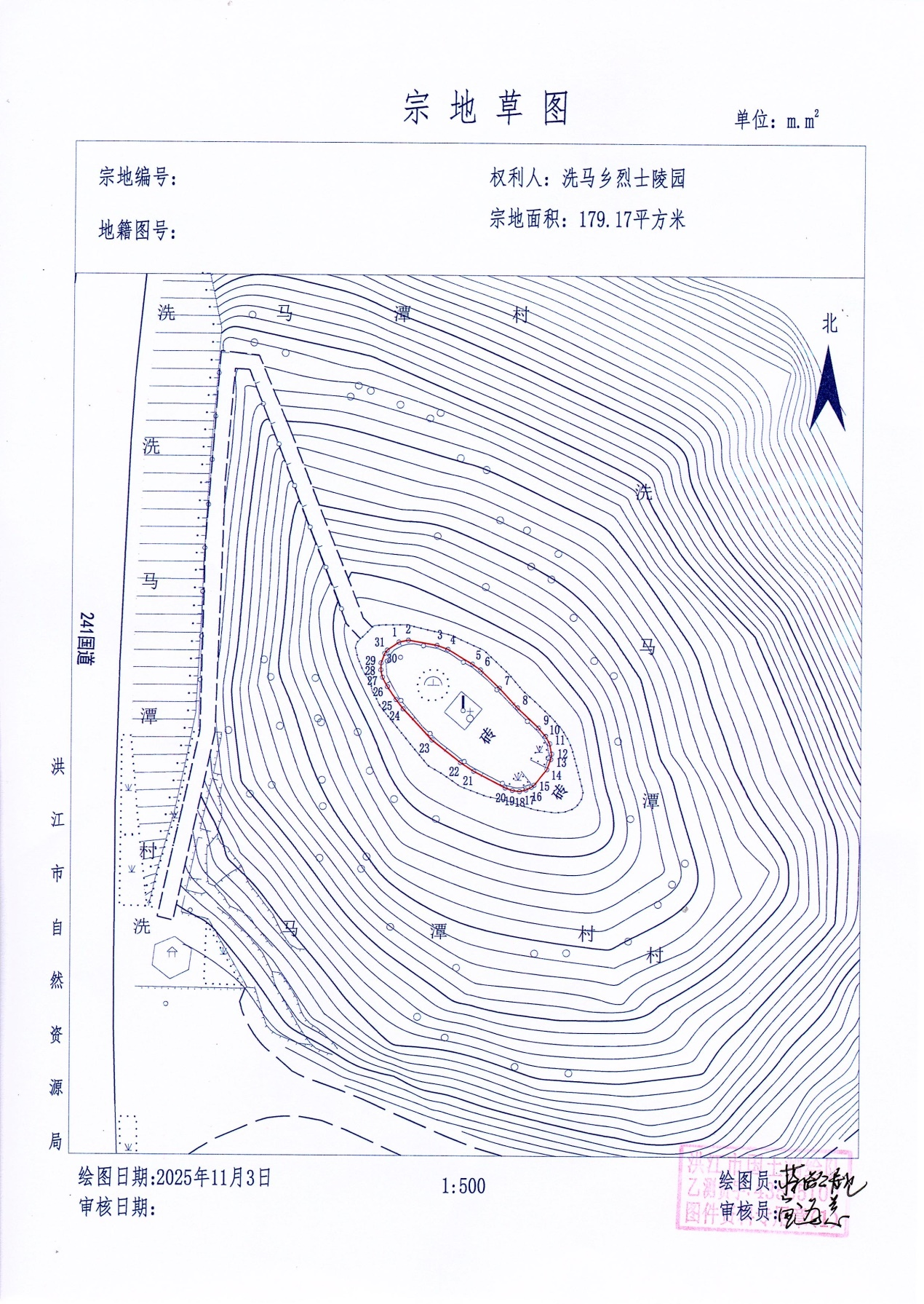 洪江市洗马乡烈士陵园,该宗地坐落于洗马乡洗马谭村一组,宗地面积为179.17平方米,现场指界确权,宗地权属四至权利人皆签字认可无异议。