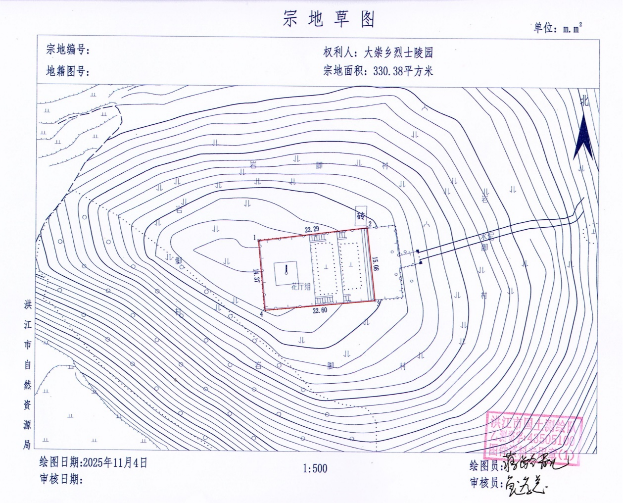 洪江市大崇乡烈士陵园,该宗地坐落于大崇乡岩脚村垴山顶,宗地面积为330.38平方米,现场指界确权,宗地权属四至权利人皆签字认可无异议。