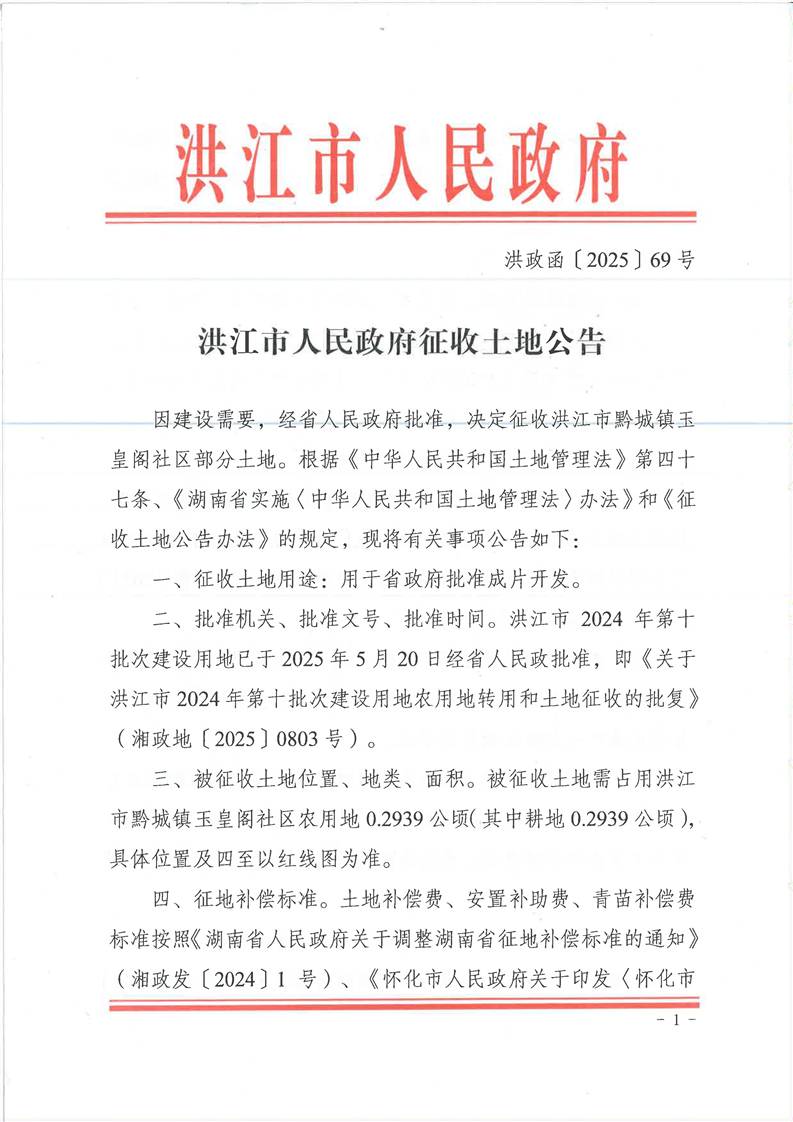 洪江市人民政府征收土地公告洪政函〔2025〕69号