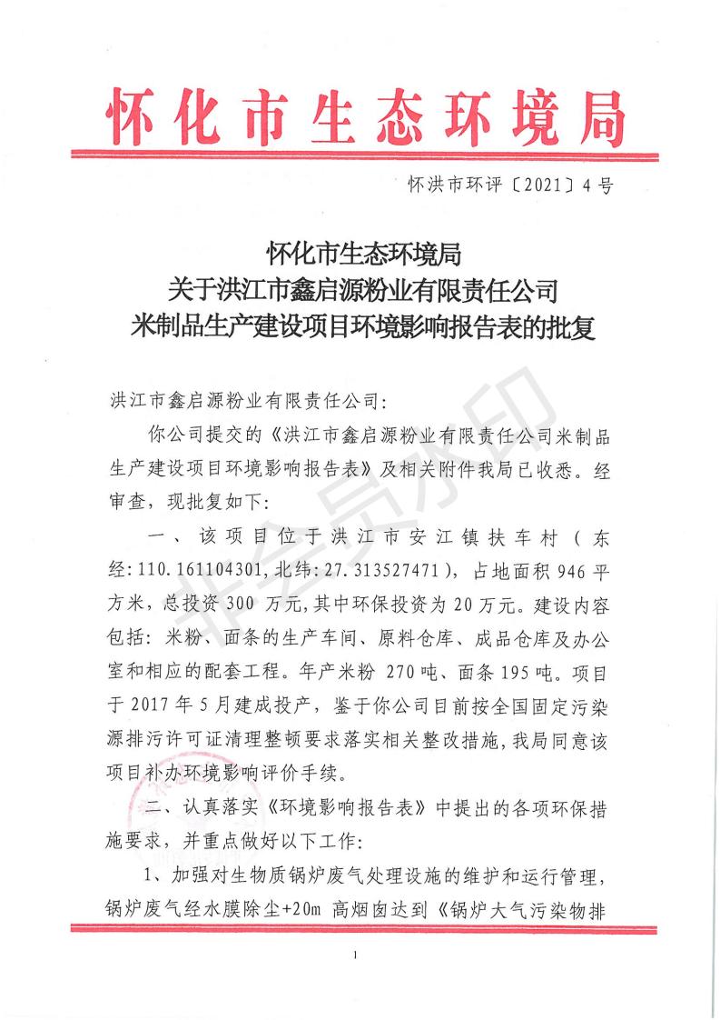 关于洪江市鑫启源粉业有限责任公司米制品生产建设项目环评批复的公示