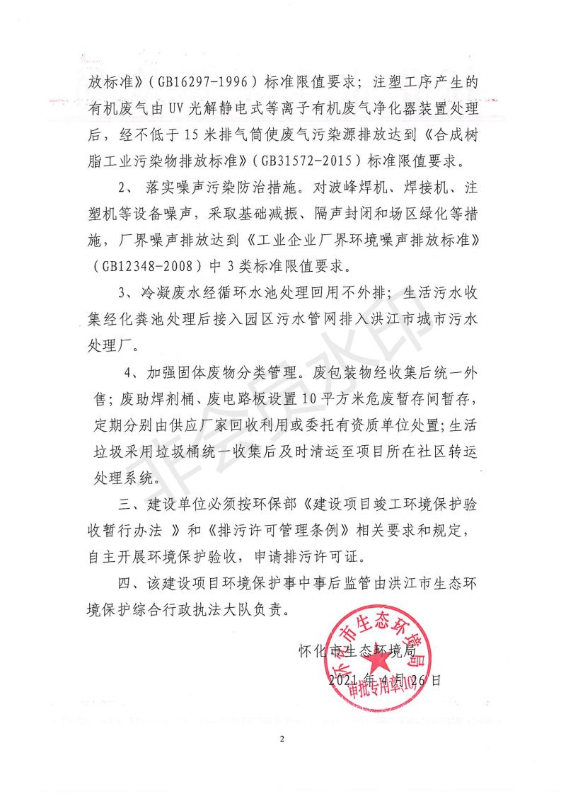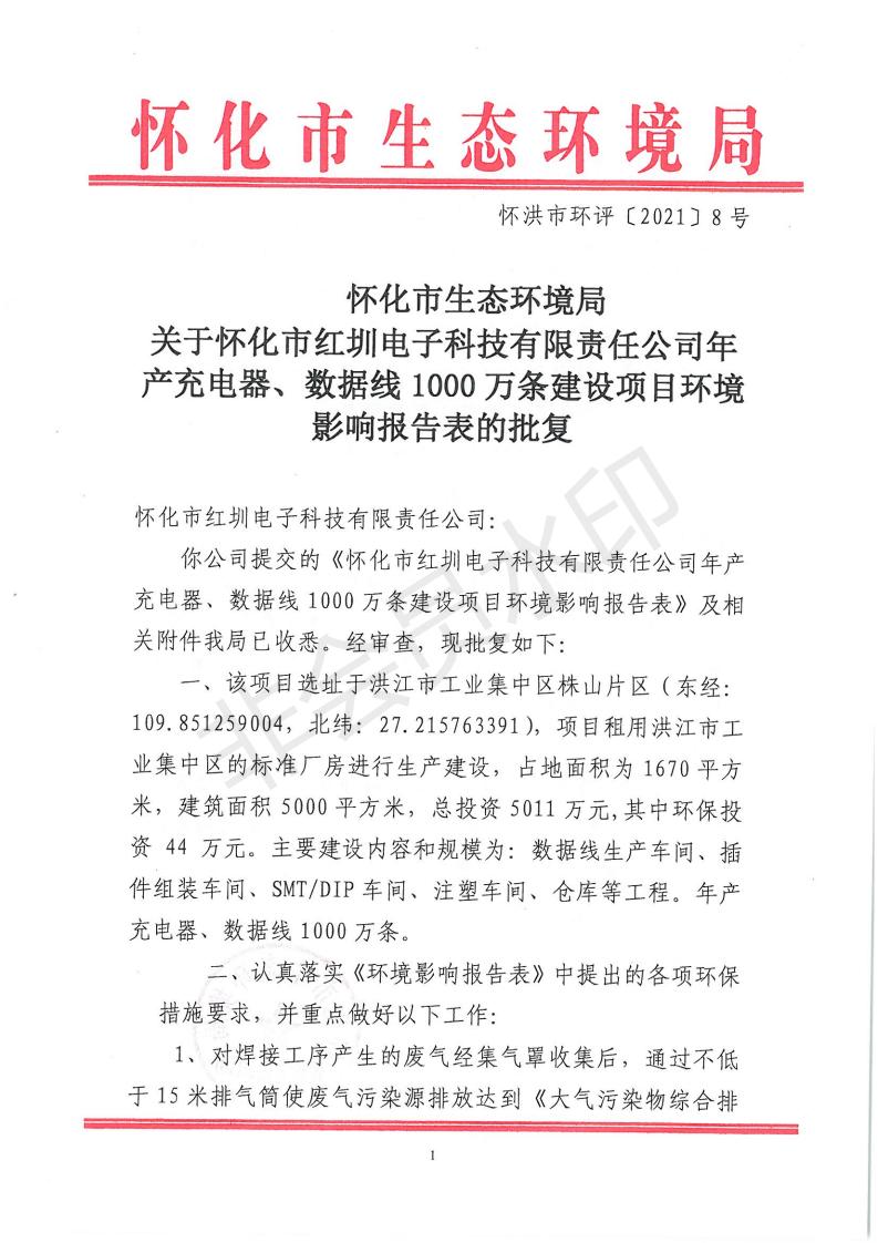 关于怀化市红圳电子科技有限责任公司年产充电器、数据线1000万条建设项目环评批复的公示