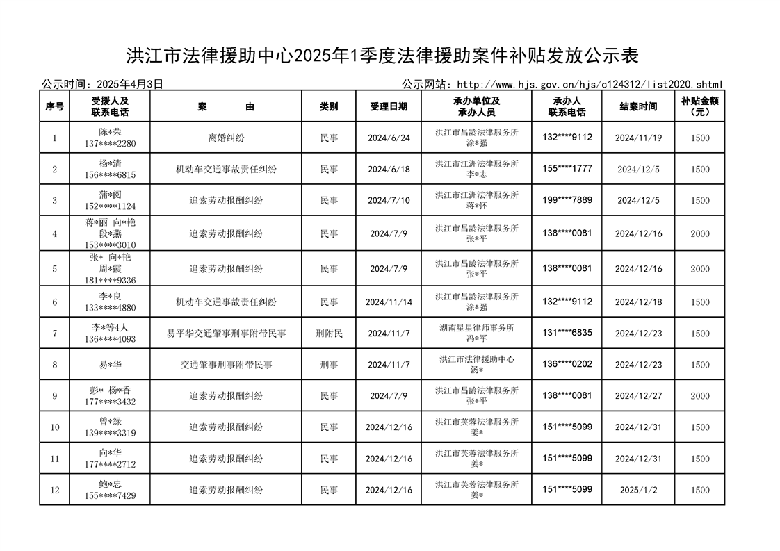 洪江市法律援助中心2025年1季度法律援助案件补贴发放公示表