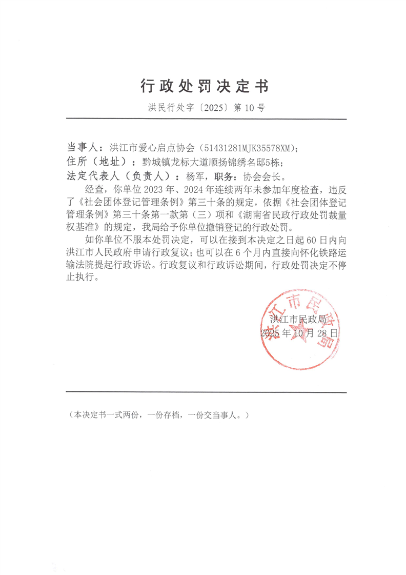 关于撤销登记“洪江市爱心启点协会”行政处罚决定书