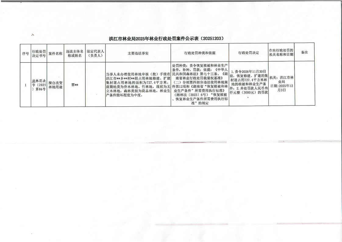 洪江市林业局2025年林业行政处罚案件公示表(20251203)洪林罚决字〔2025〕第86号