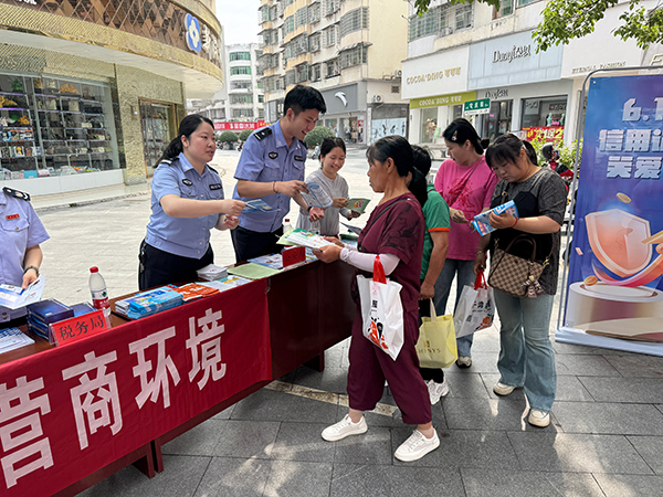 为提升广大市民的信用意识,营造“诚信为荣,失信为耻”的社会氛围,在6月14日“信用记录关爱日”来临之际,洪江市公安局在黔城镇滨江路牛头湾集贸市场对面联合发改局、税务局、住建局、金融办等多家单位开展以“爱征信、惠民生、助发展”为主题的信用宣传活动。
