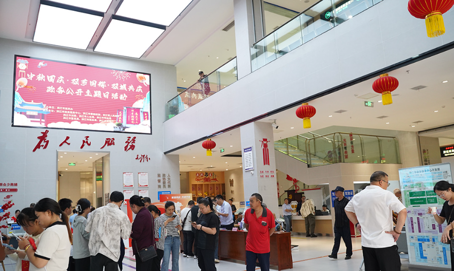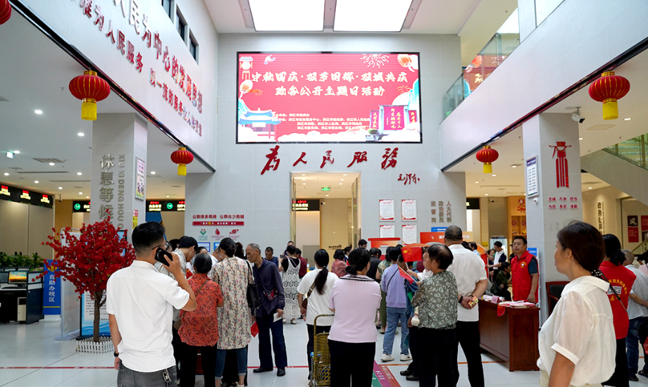 活动以“月圆国盛·政务暖心”为主题,在洪江市政务服务中心主入口设置动态电子屏,融合芙蓉楼地标、玉兔明月、国旗华表等元素,配合《我和我的祖国》等红色经典音乐,营造出庄重而温馨的节日氛围。安江政务中心则以“杂交水稻纪念园”为地域特色,通过展板展示“红色领航·家国同庆”子主题,双城同步悬挂主题窗花、党旗国旗,形成“一城一景”的政务服务新风貌。
