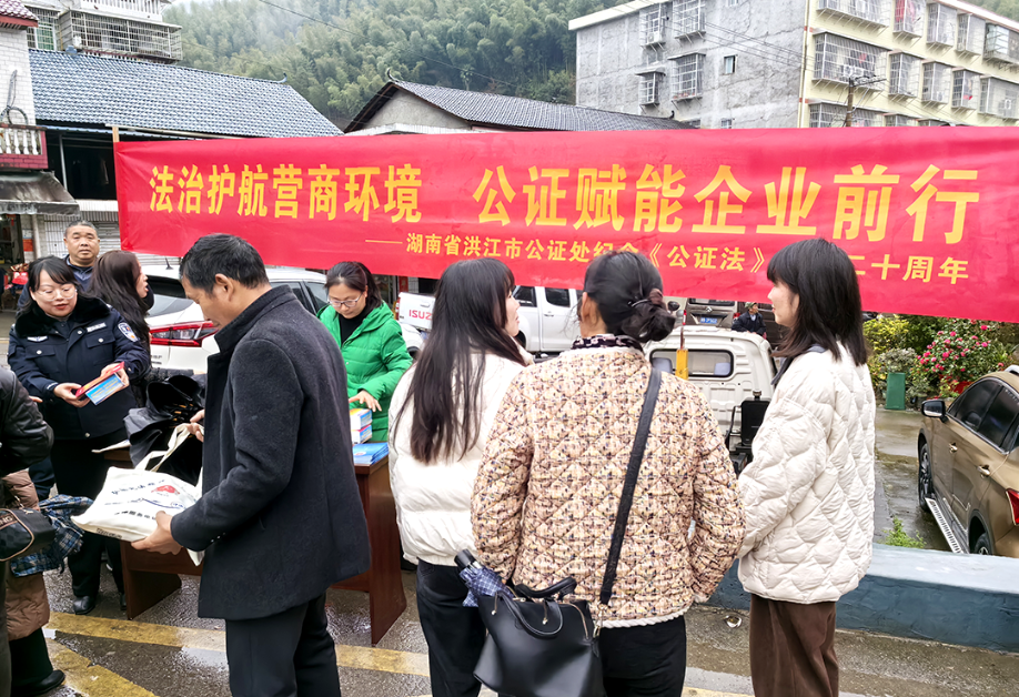 2026年3月1日是《中华人民共和国公证法》施行二十周年纪念日。为进一步加大《中华人民共和国公证法》宣传力度,推进洪江市公证工作高质量发展,2月27日,在省公证协会、怀化市司法局的组织指导下,洪江市司法局、洪江市公证处积极行动,组织返乡高校大学生志愿者来到我市深渡苗族乡举办“法治护航营商环境 公证赋能企业前行”主题宣传活动、“法援志愿行 3·5 学雷锋纪念日主题志愿服务活动”、洪江市大学生普法志愿者“送法下乡”活动。