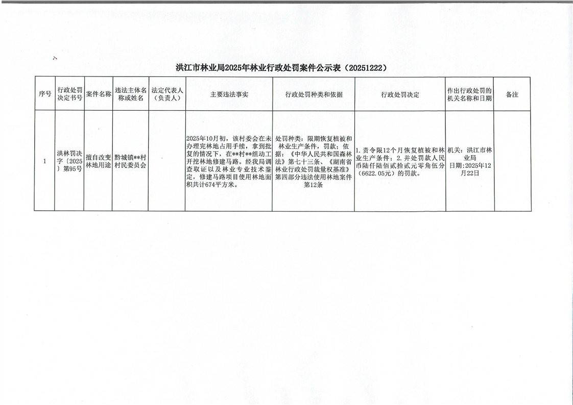 洪江市林业局2025年林业行政处罚案件公示表(20251222)