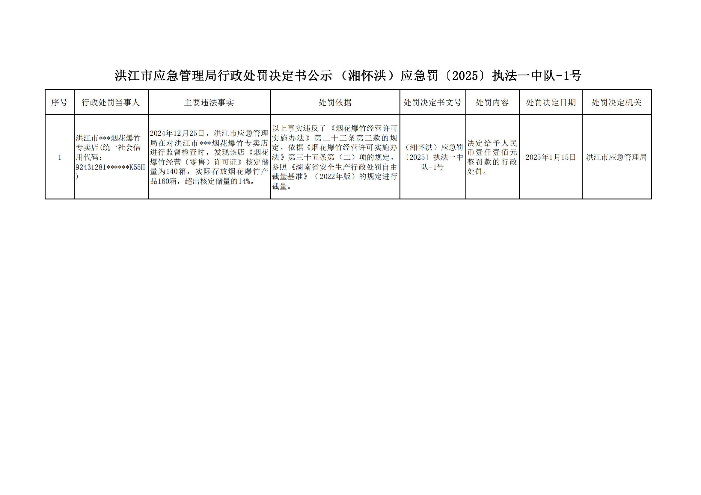 洪江市应急管理局行政处罚决定书(湘怀洪)应急罚〔2025〕执法一中队-1号