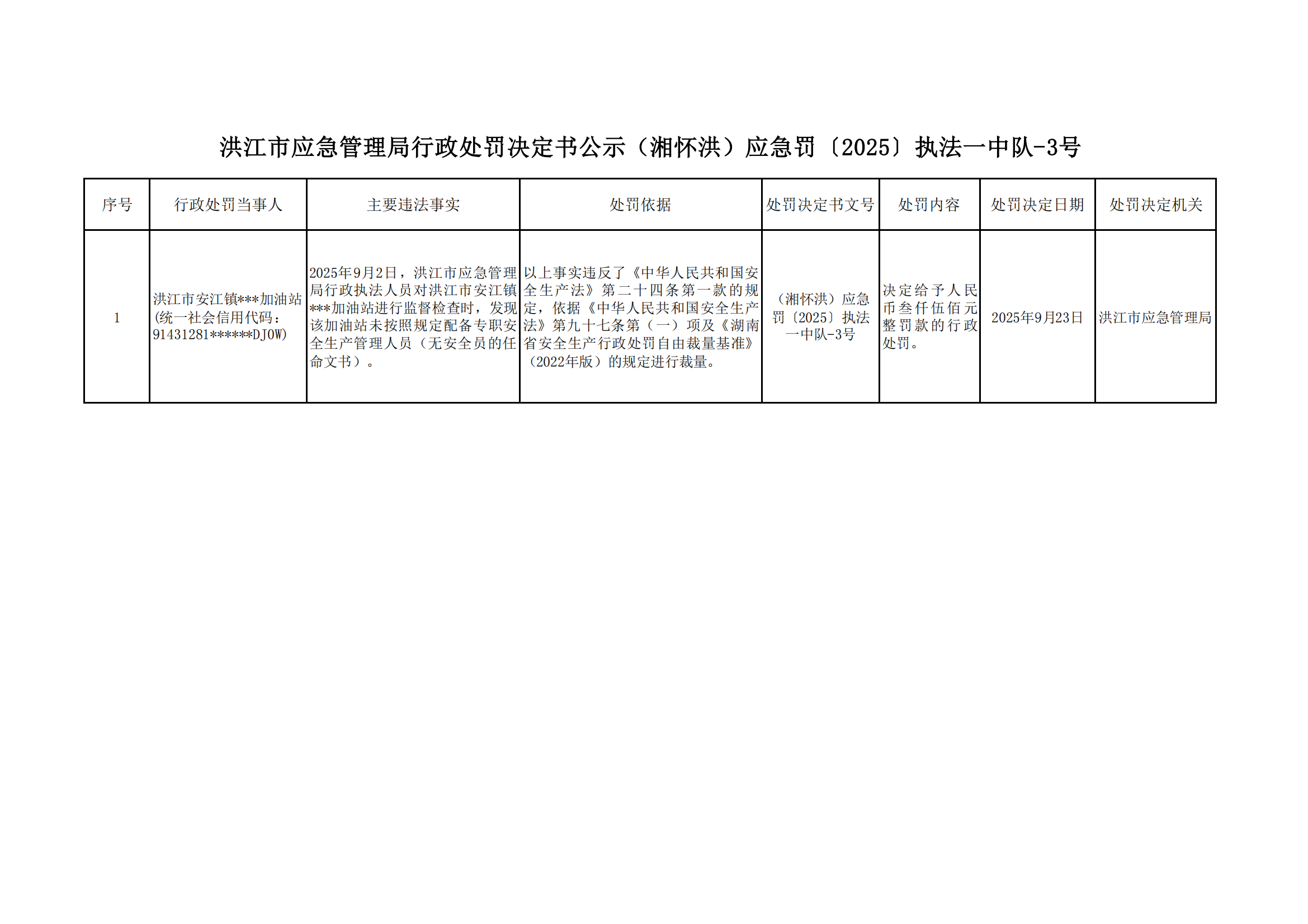 洪江市应急管理局行政处罚决定书(湘怀洪)应急罚〔2025〕执法一中队-3号