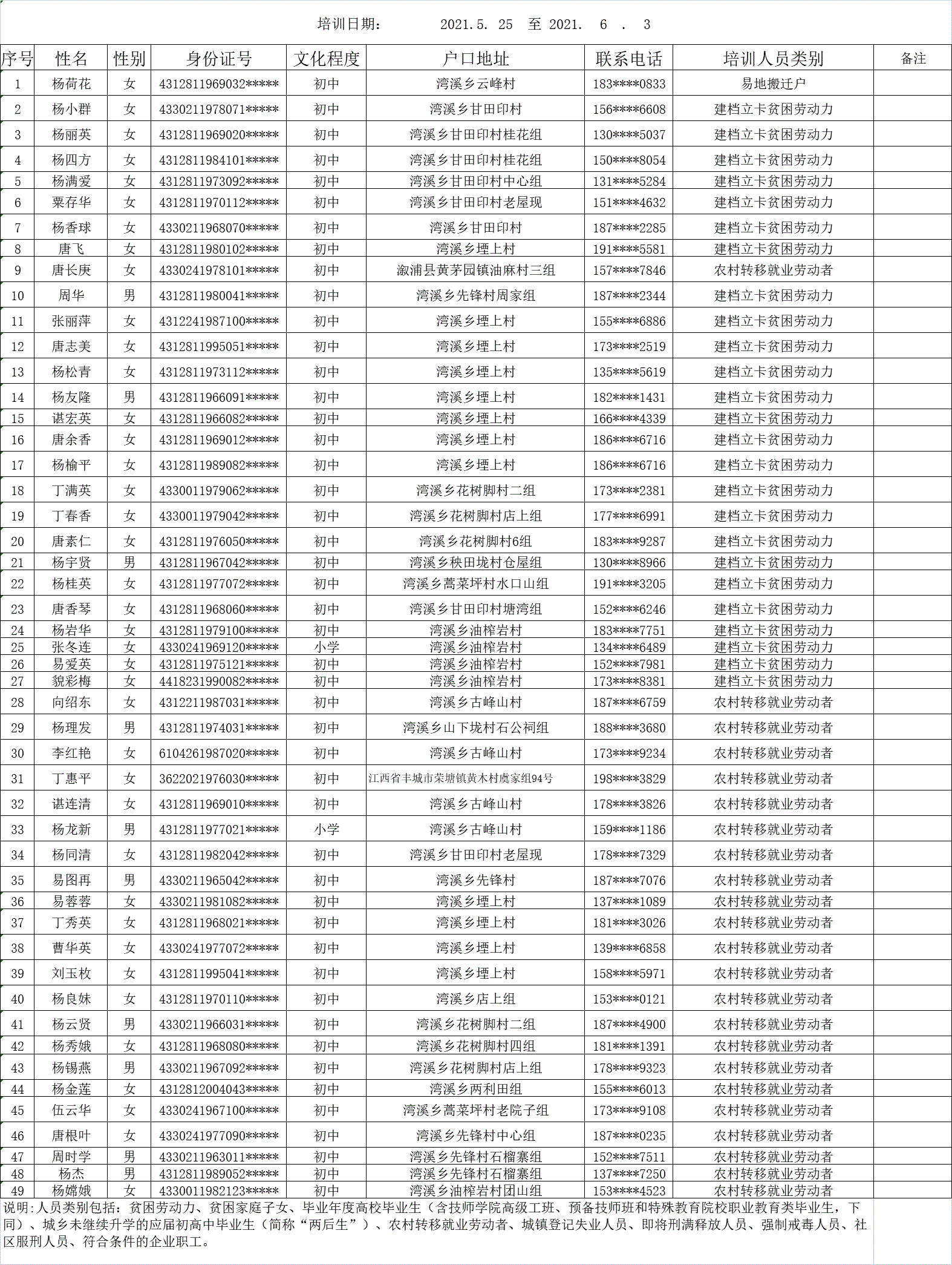 2021年洪江市湾溪乡食品加工工公示学员花名册