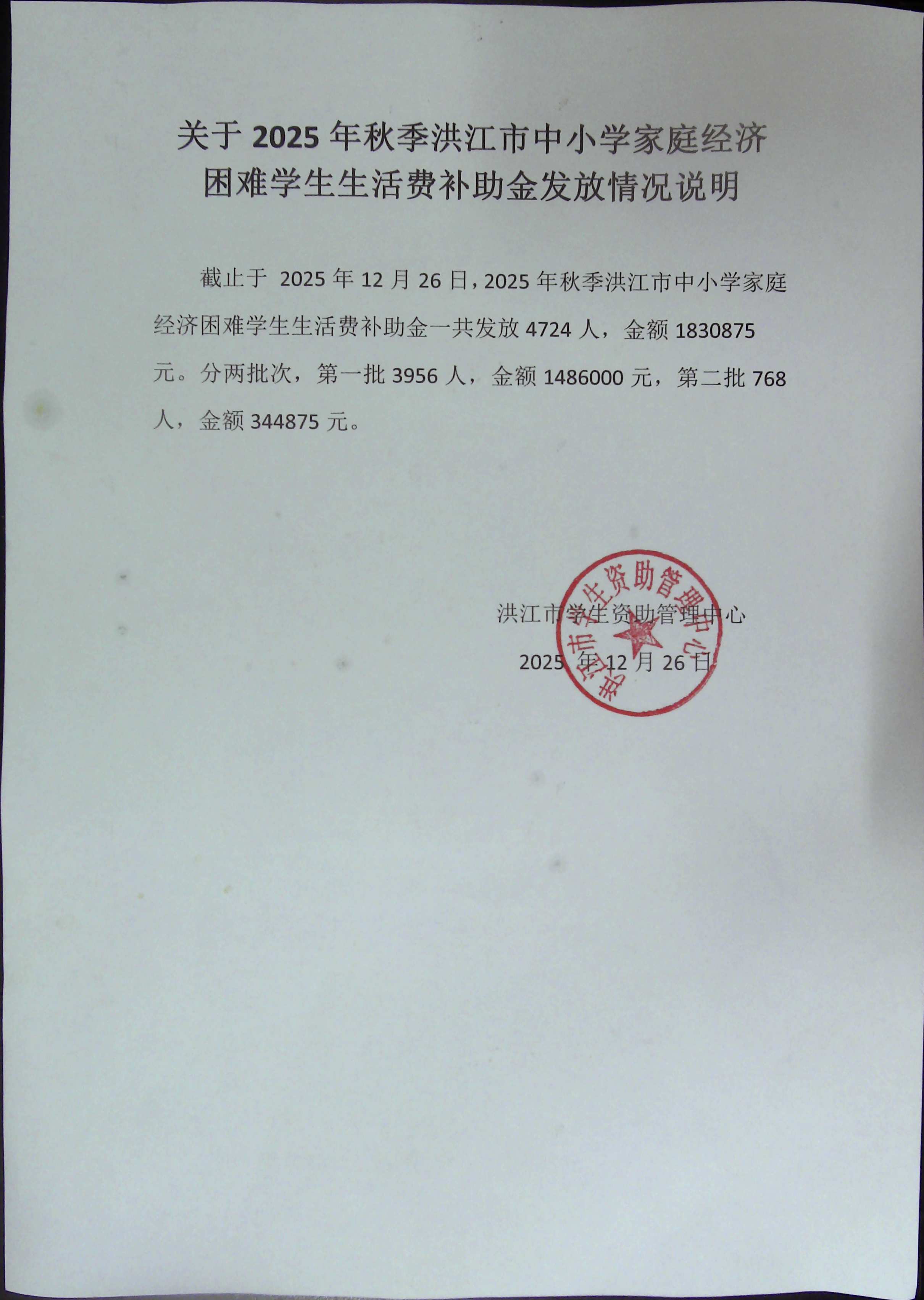关于2025年秋季洪江市中小学家庭经济困难学生生活费补助金发放情况说明
