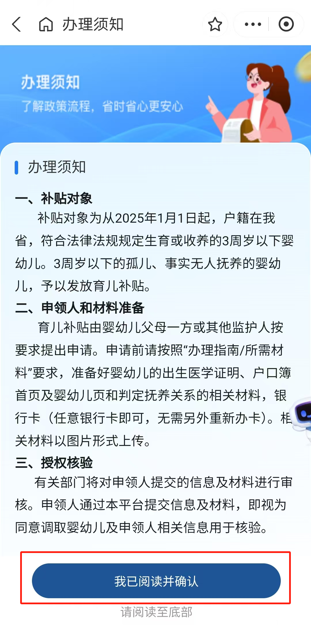 实名登录“湘易办”APP,在首页选择“育儿补贴”服务后点击“我要申请补贴”,阅读办理须知并确认,如实填写补贴对象信息、申领人信息、补贴收款信息,上传相关材料后确认提交,等待审核即可。