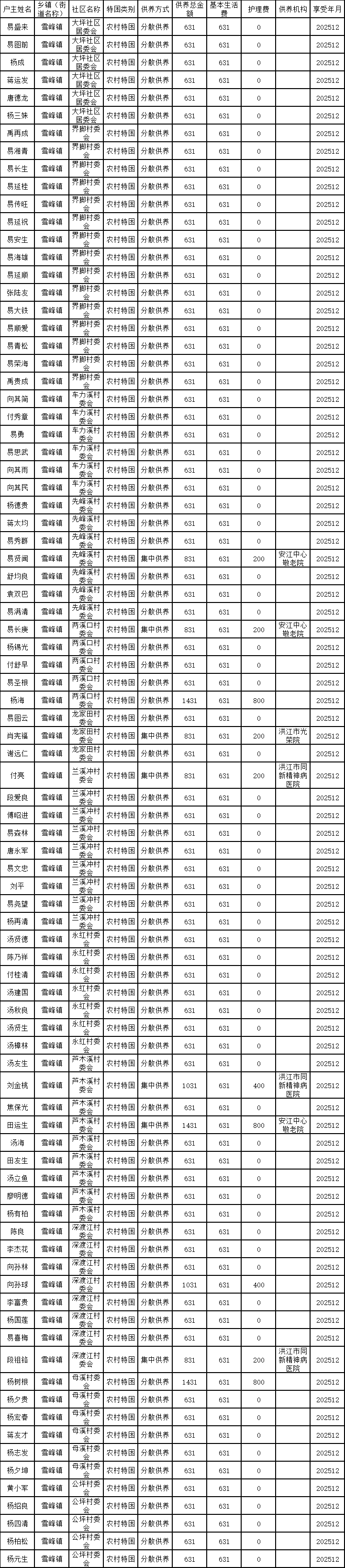 洪江市雪峰镇2025年12月份特困人员供养家庭公示表