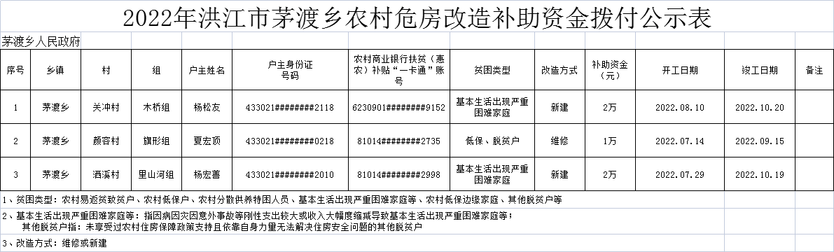 2022年洪江市茅渡乡农村危房改造补助资金拨付公示