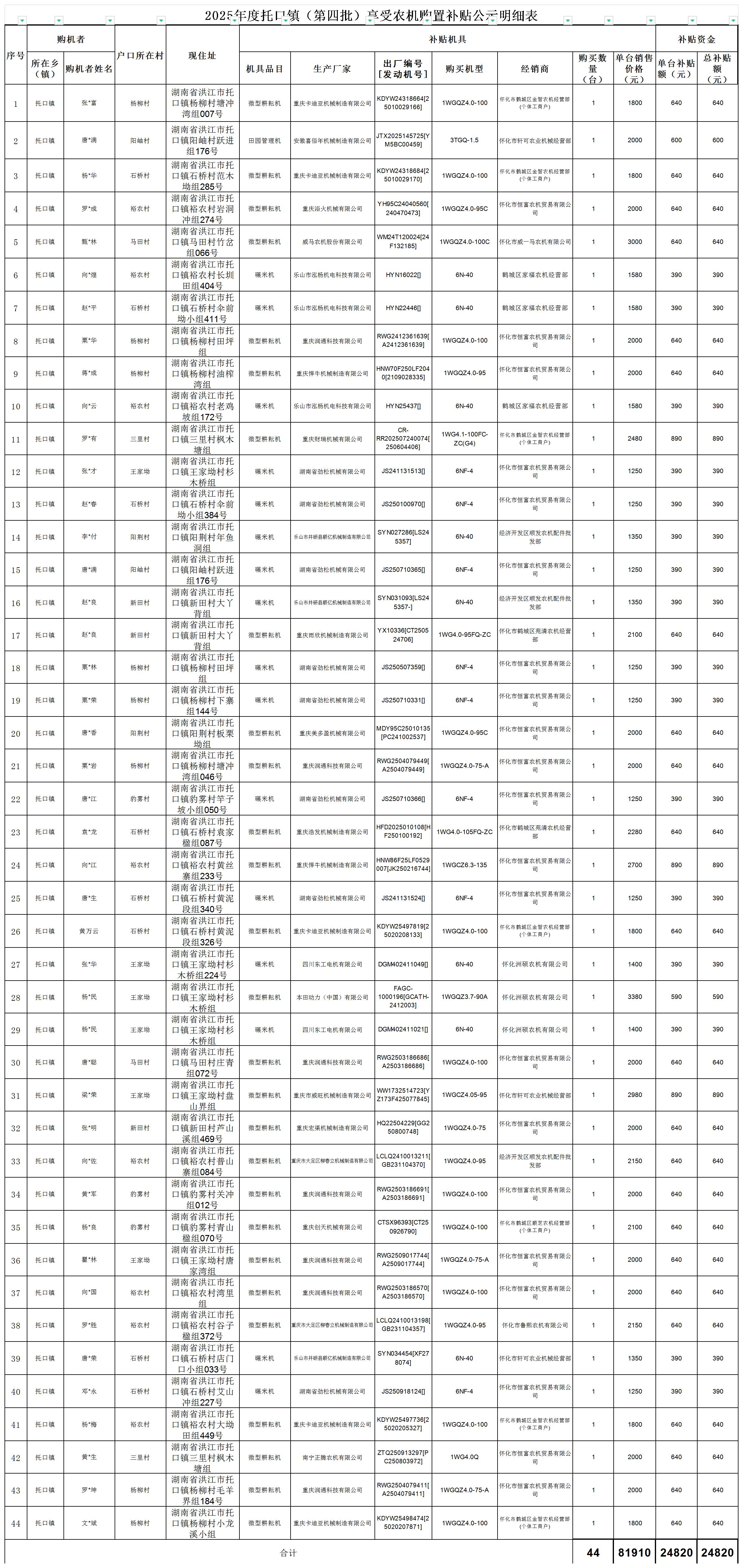2025年度托口镇(第四批)享受农机购置补贴公示明细表
