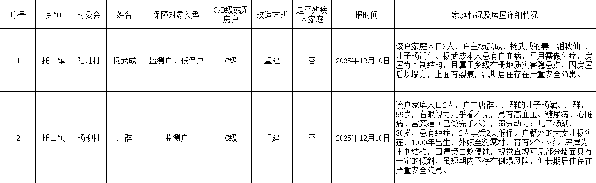 洪江市托口镇2026年度农村危房改造计划任务摸底表