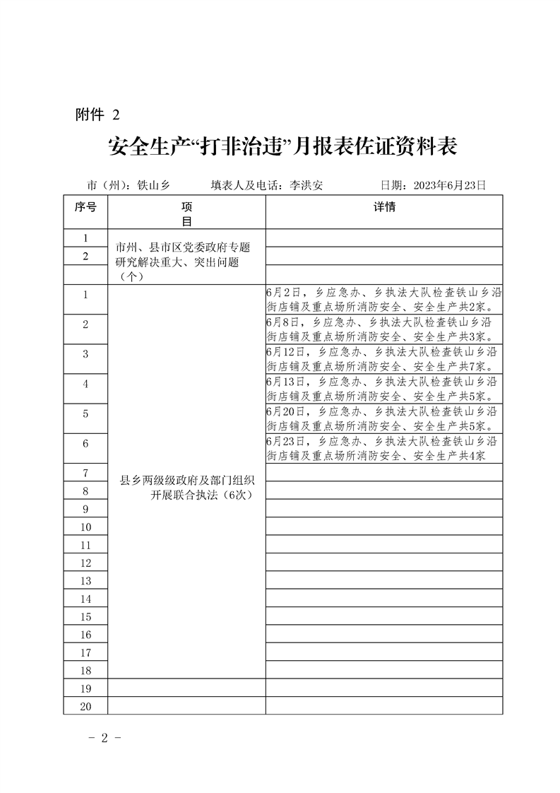 铁山乡5月22至6月22日安全生产“打非治违”月报表