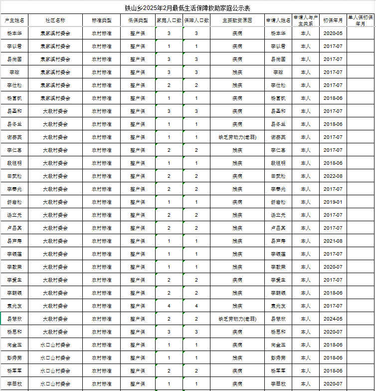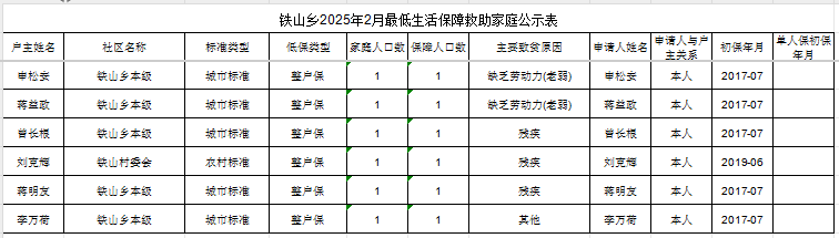 铁山乡2025年2月最低生活保障救助家庭公示表
