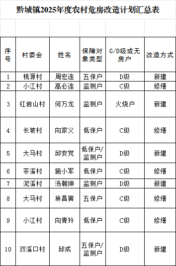 2025年洪江市黔城镇危房改造名单公示