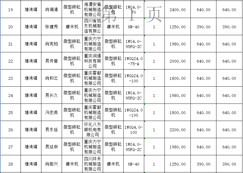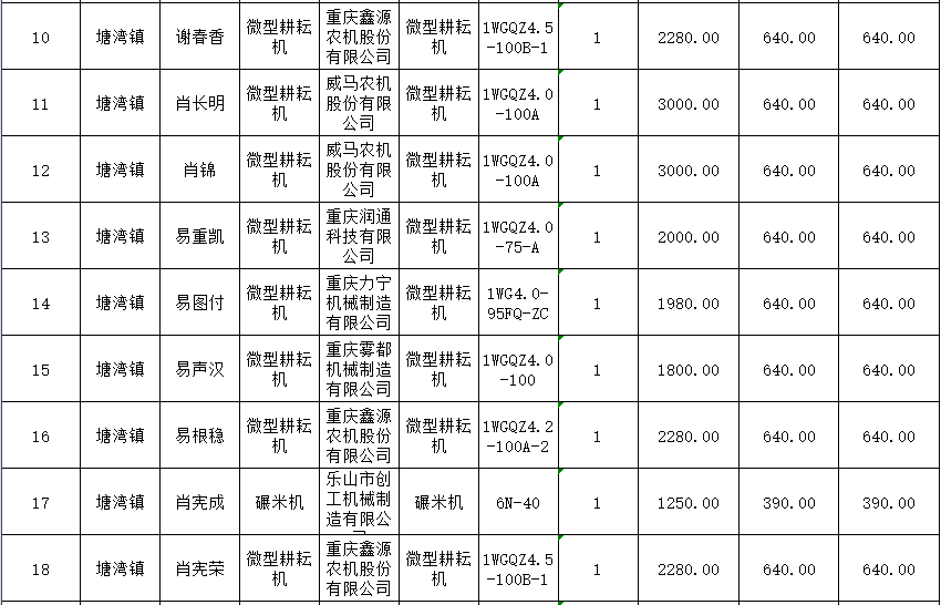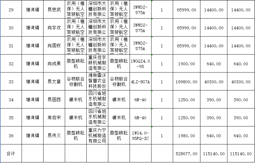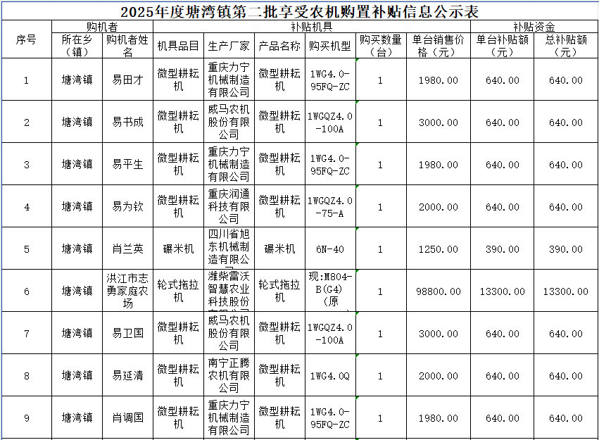 2025年度塘湾镇第二批享受农机购置补贴信息公示表