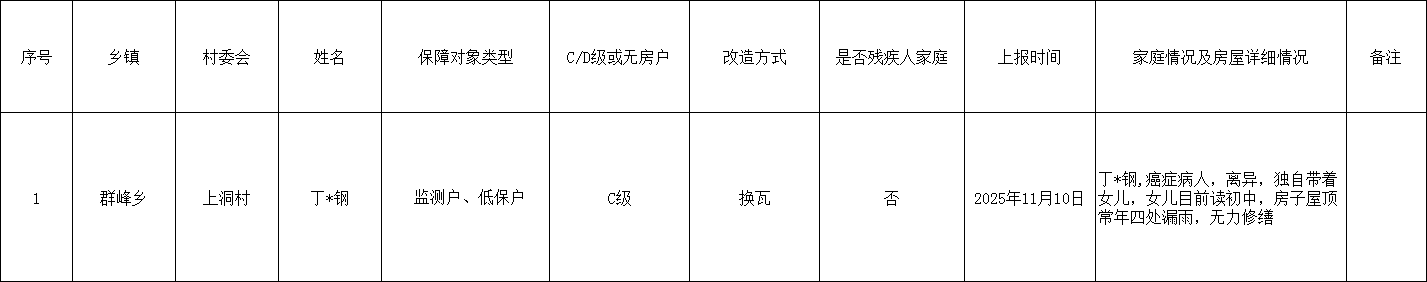 群峰乡2026年度危房改造计划任务摸排表