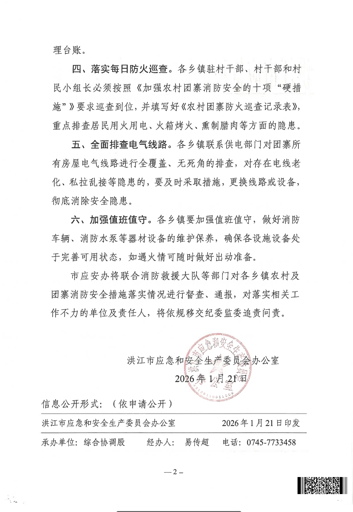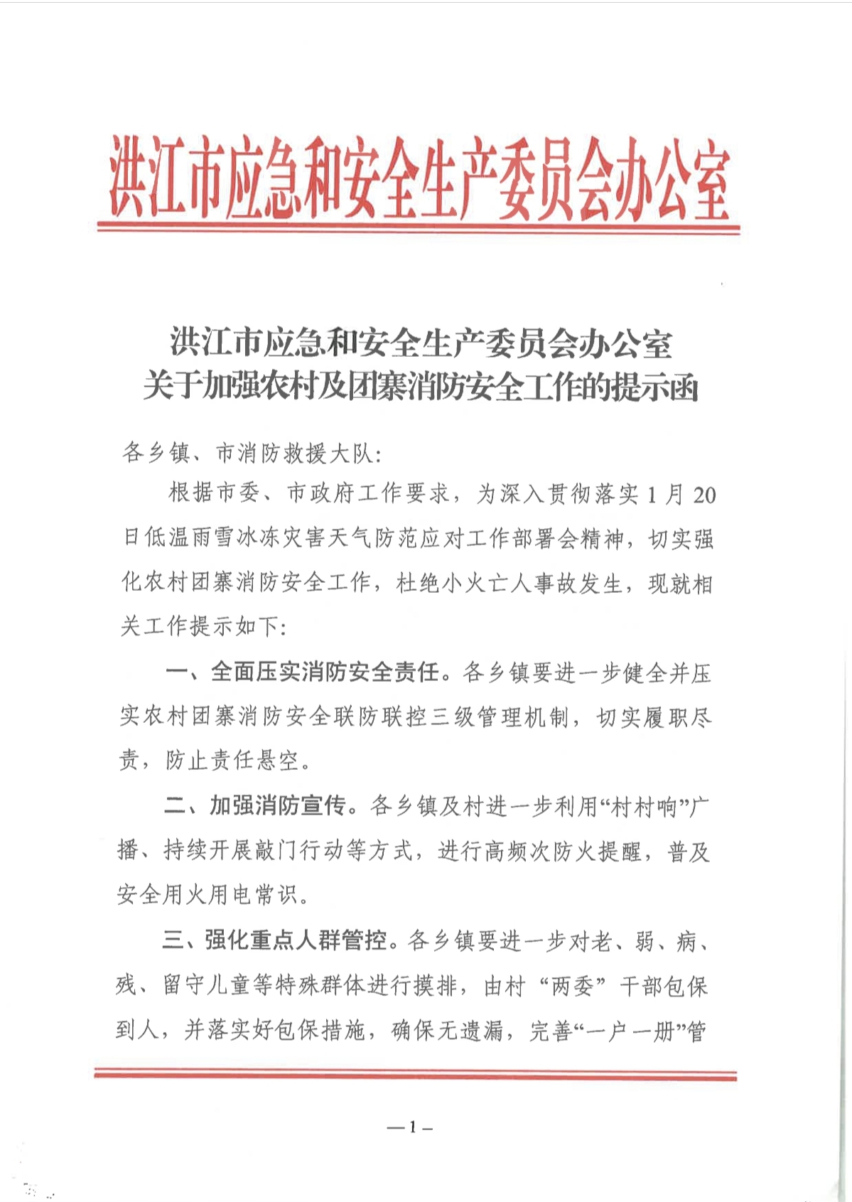 洪江市应急和安全生产委员会办公室关于加强农村及团寨消防安全工作的提示函