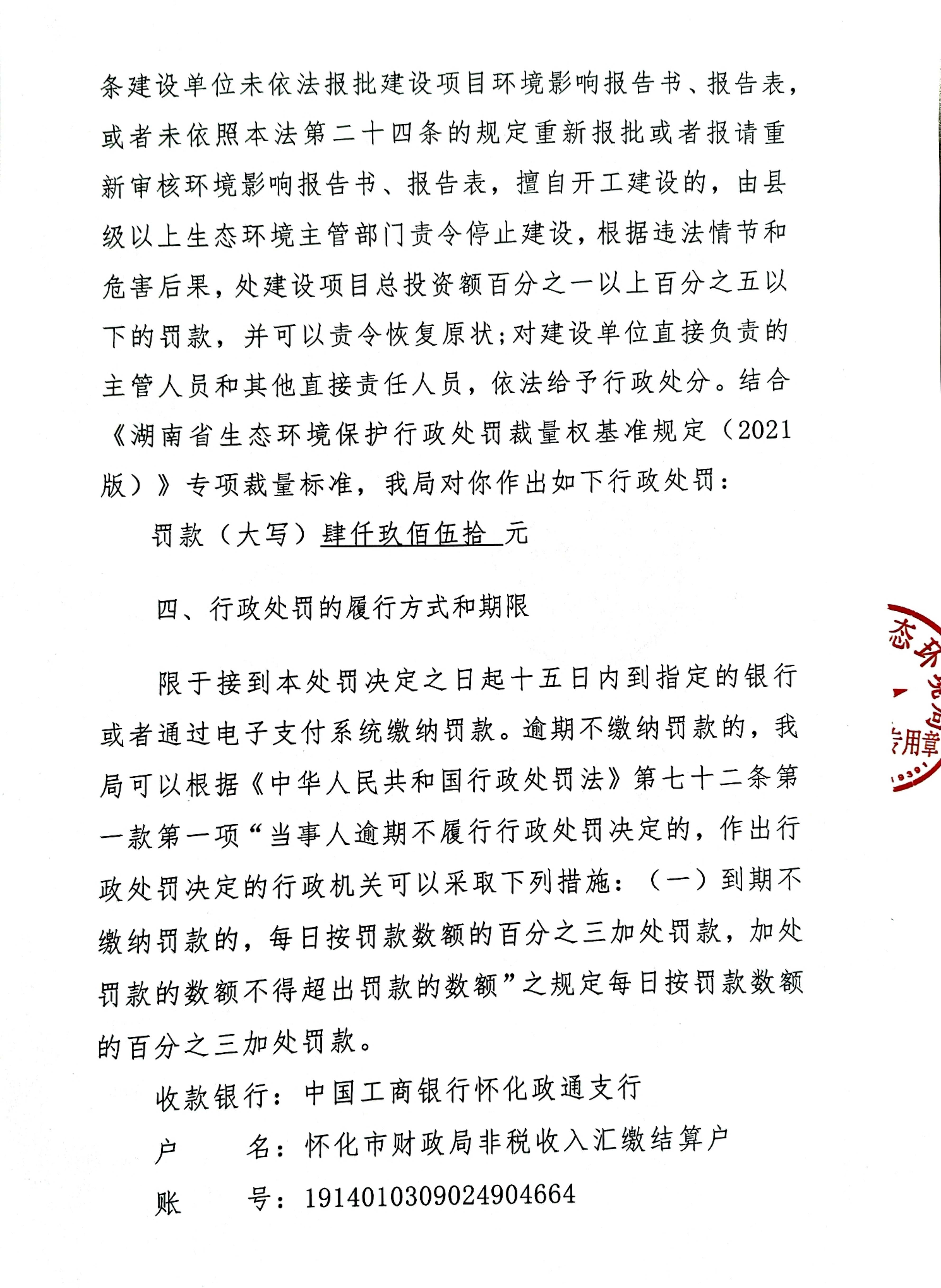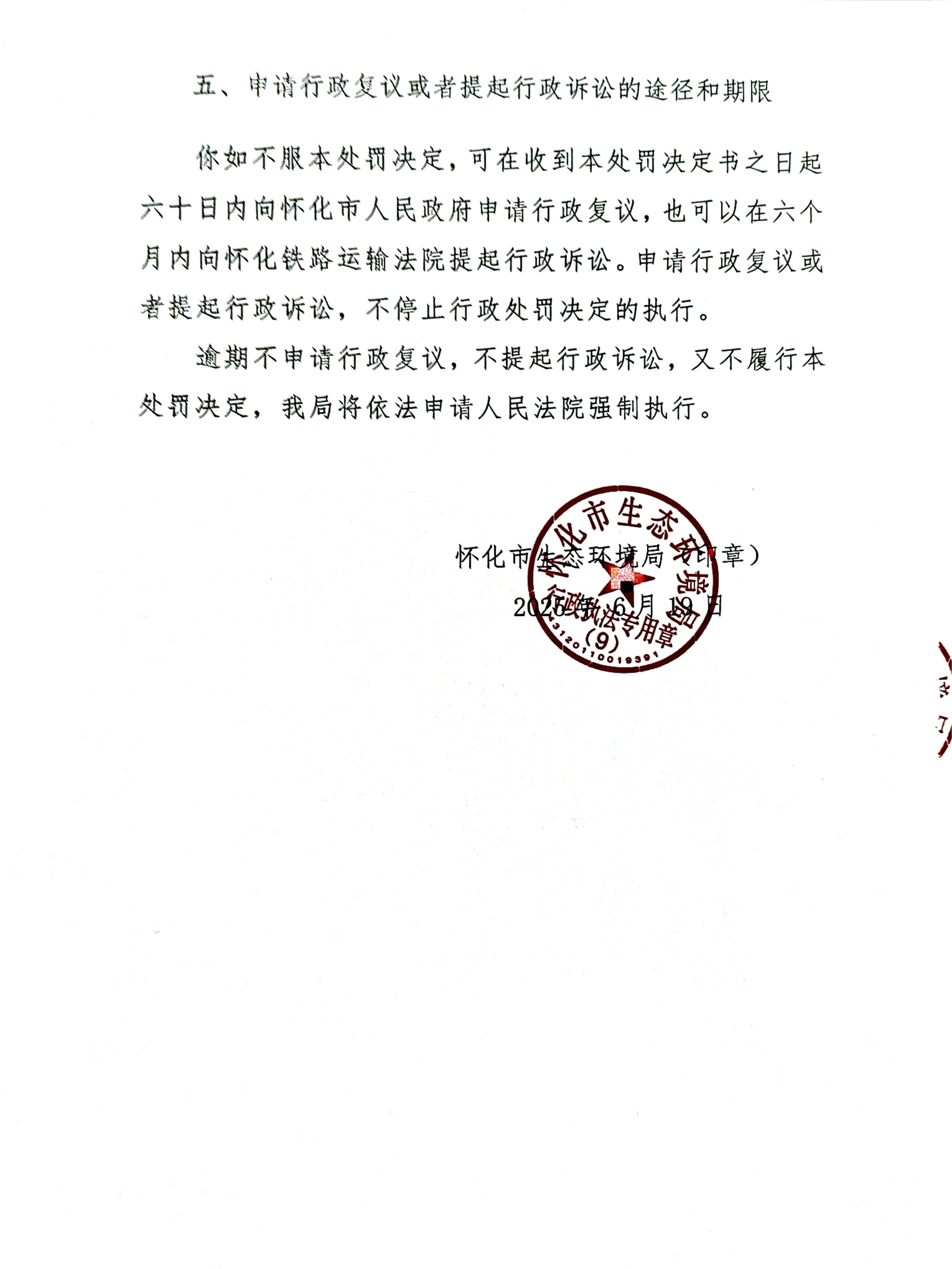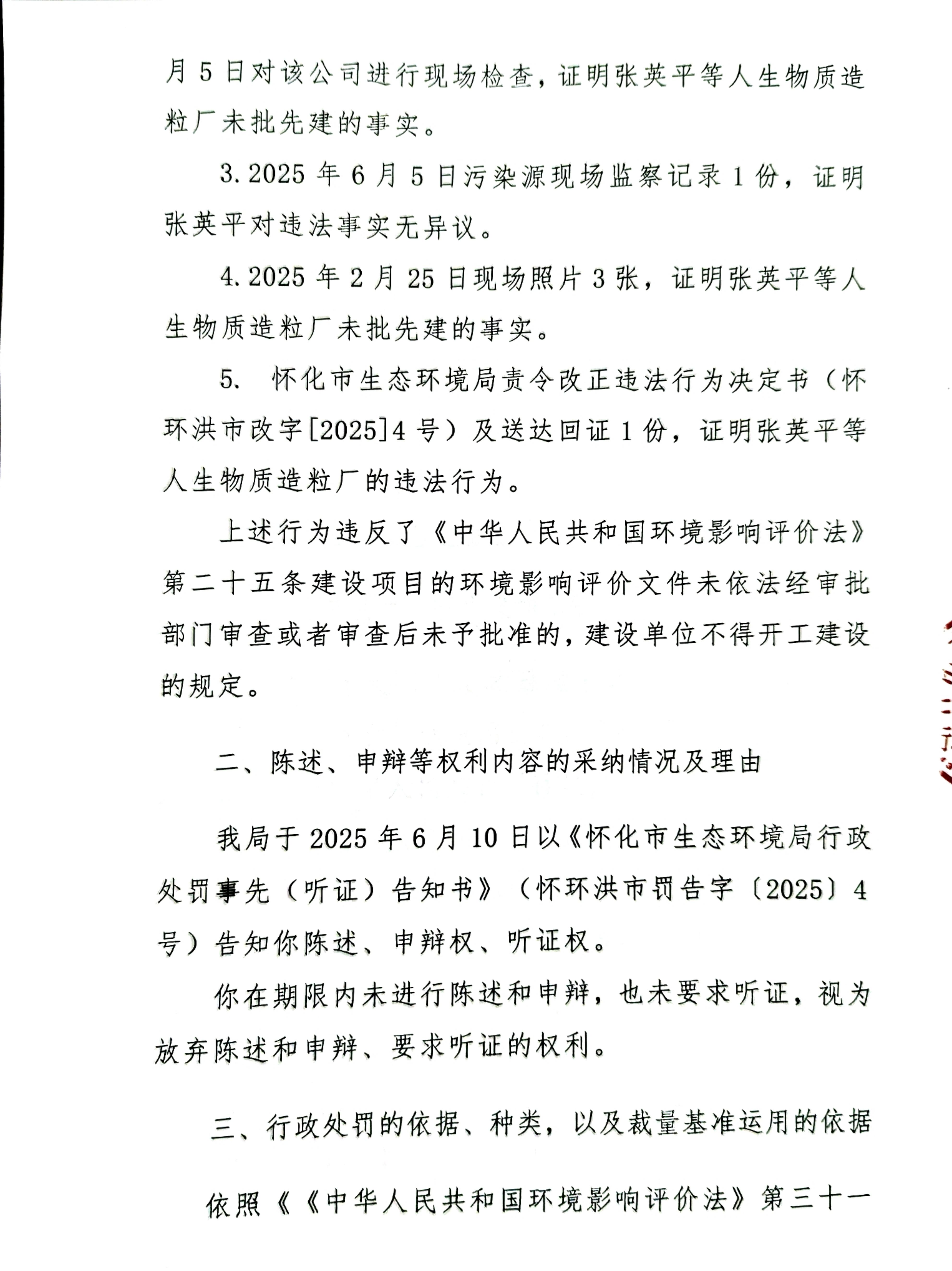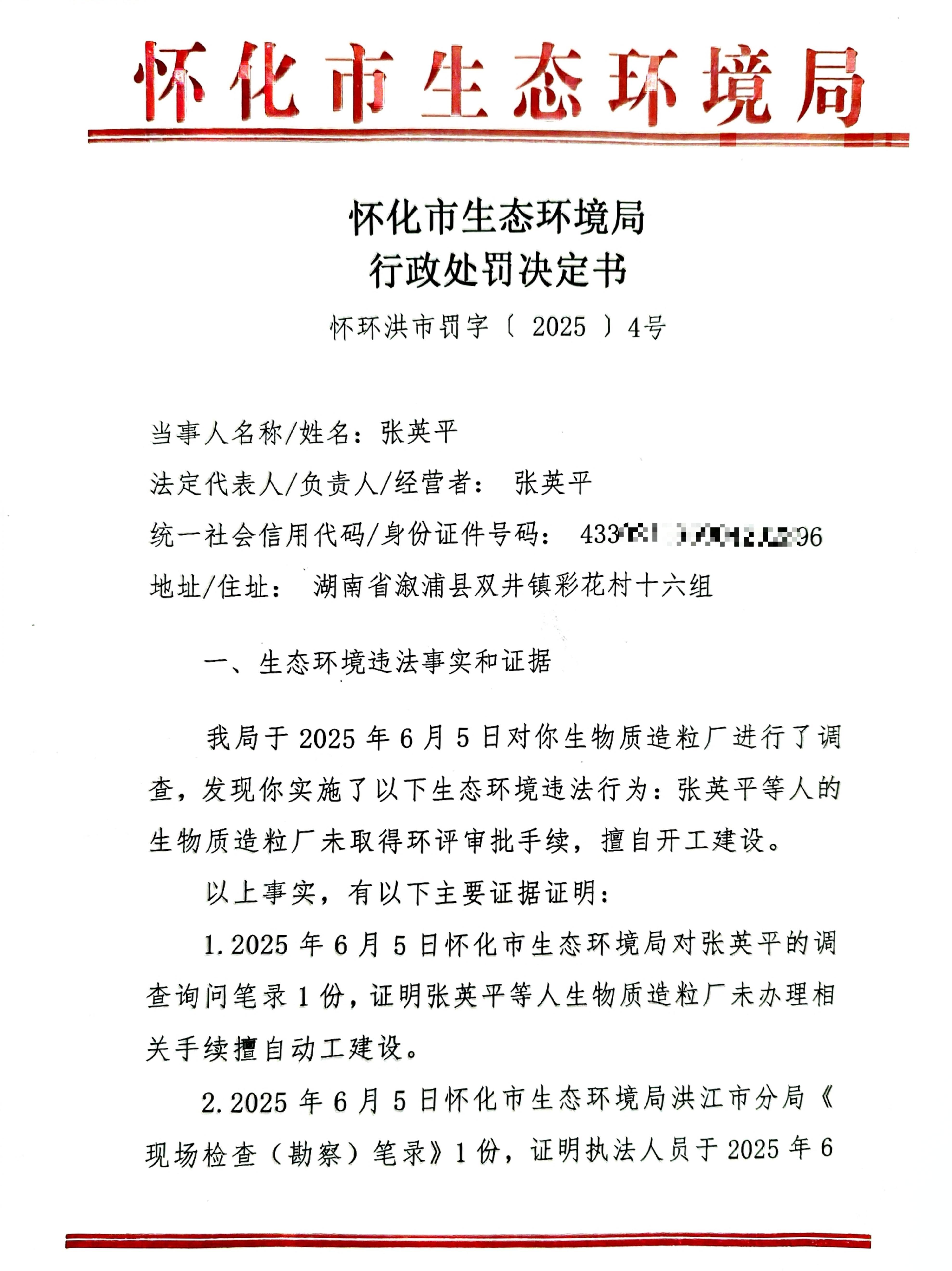 (二审)关于对张英平行政处罚决定书的公示(怀环洪市罚字〔2025〕4号)