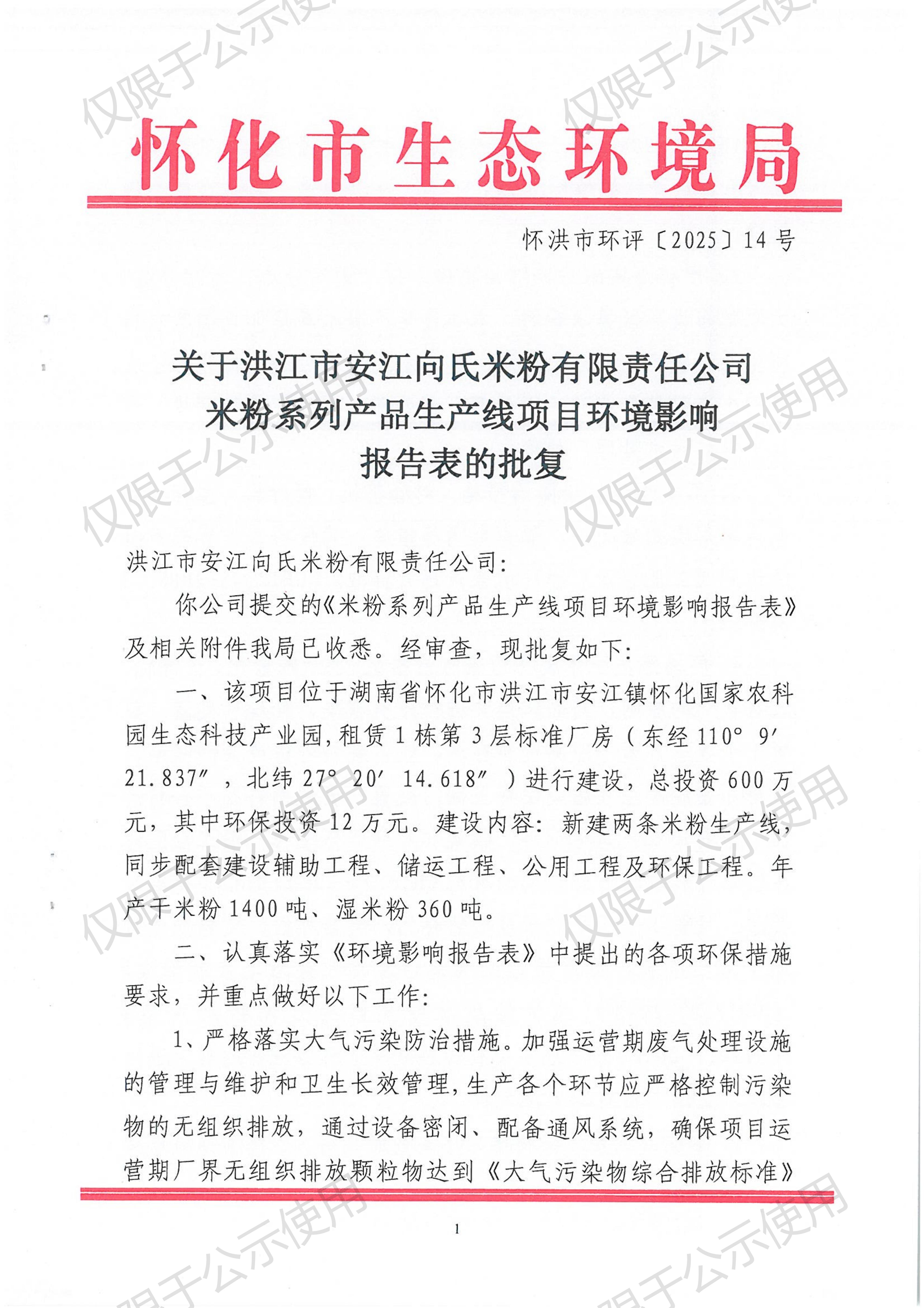 洪江市安江向氏米粉有限责任公司米粉系列产品生产线项目环境影响报告表的批复