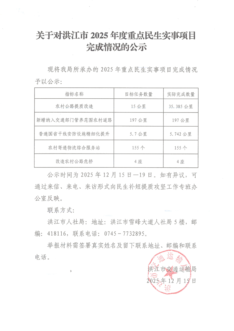 关于对洪江市交通局2025年度重点民生实事项目完成情况的公示