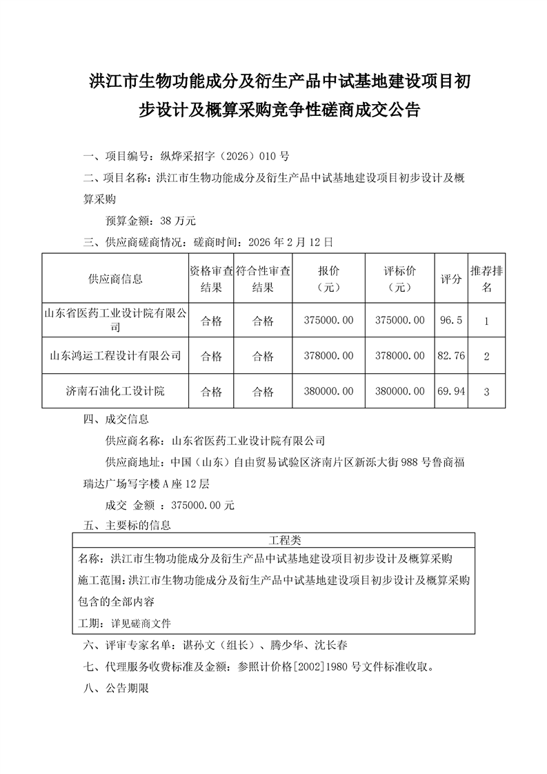 洪江市生物功能成分及衍生产品中试基地建设项目初步设计及概算采购竞争性磋商成交公告